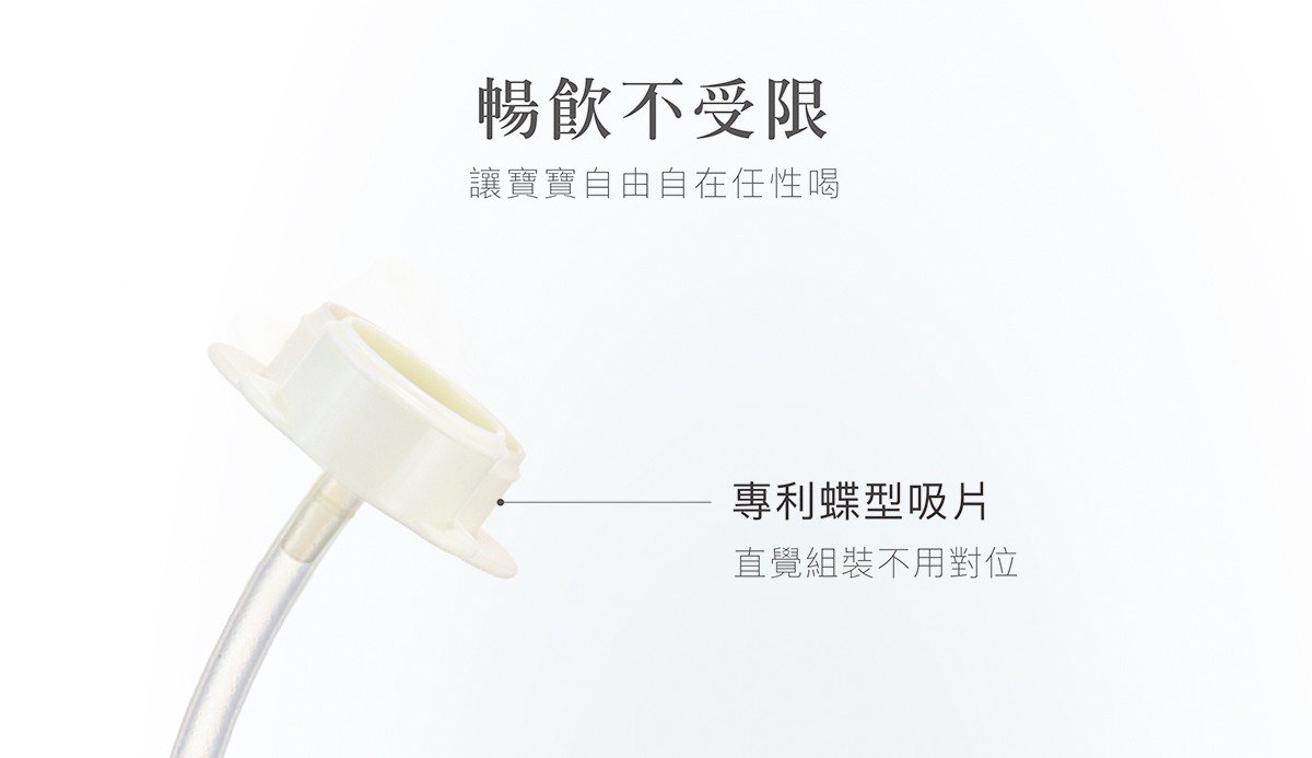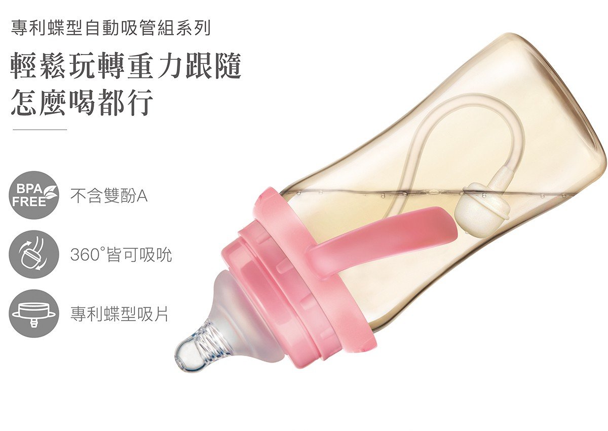 嚴選食品級柔軟矽膠自動吸管,SGS檢驗不含雙酚A,360°自動導管珠可隨奶瓶角度落至飲品中,不管站著或是躺著都能暢飲不受限。