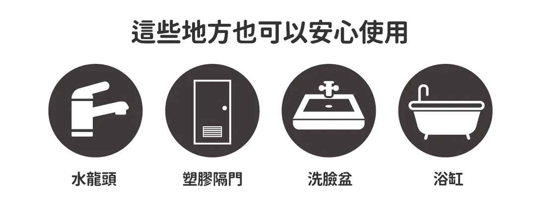 ►適用範圍:浴廁玻璃、水龍頭、洗臉盆、蓮蓬頭、磁磚表面及縫隙。※ 請勿使用於大理石、花崗石等天然岩類、花色磁磚、釉面臉盆,避免破壞紋路。
