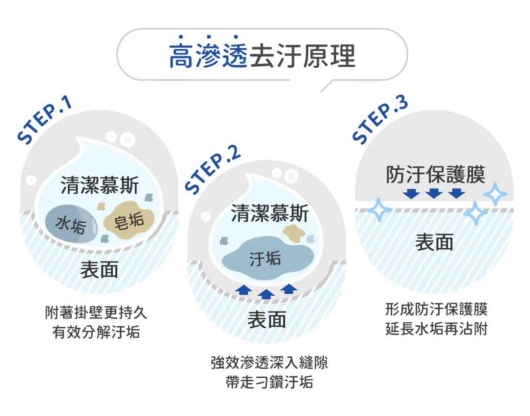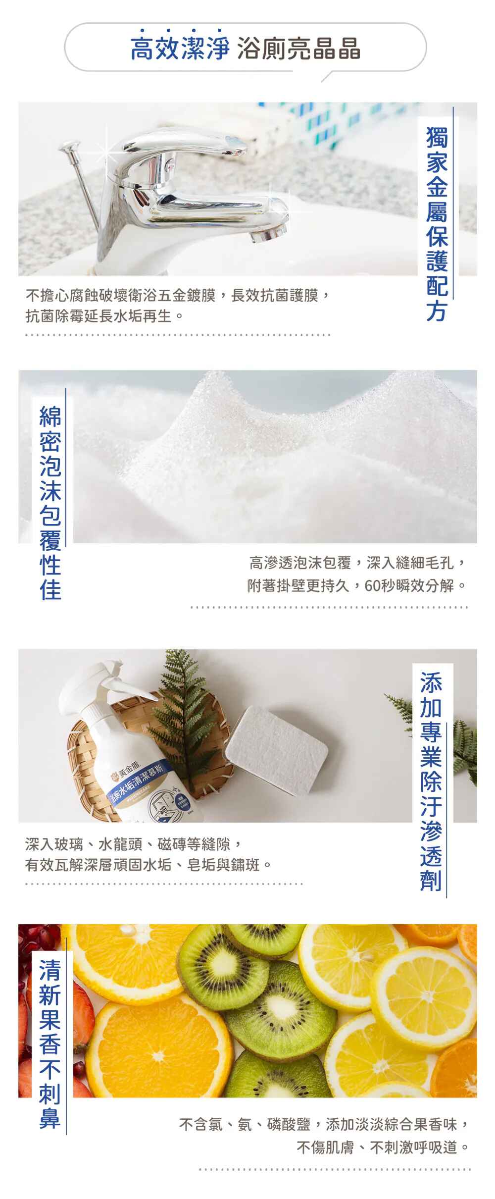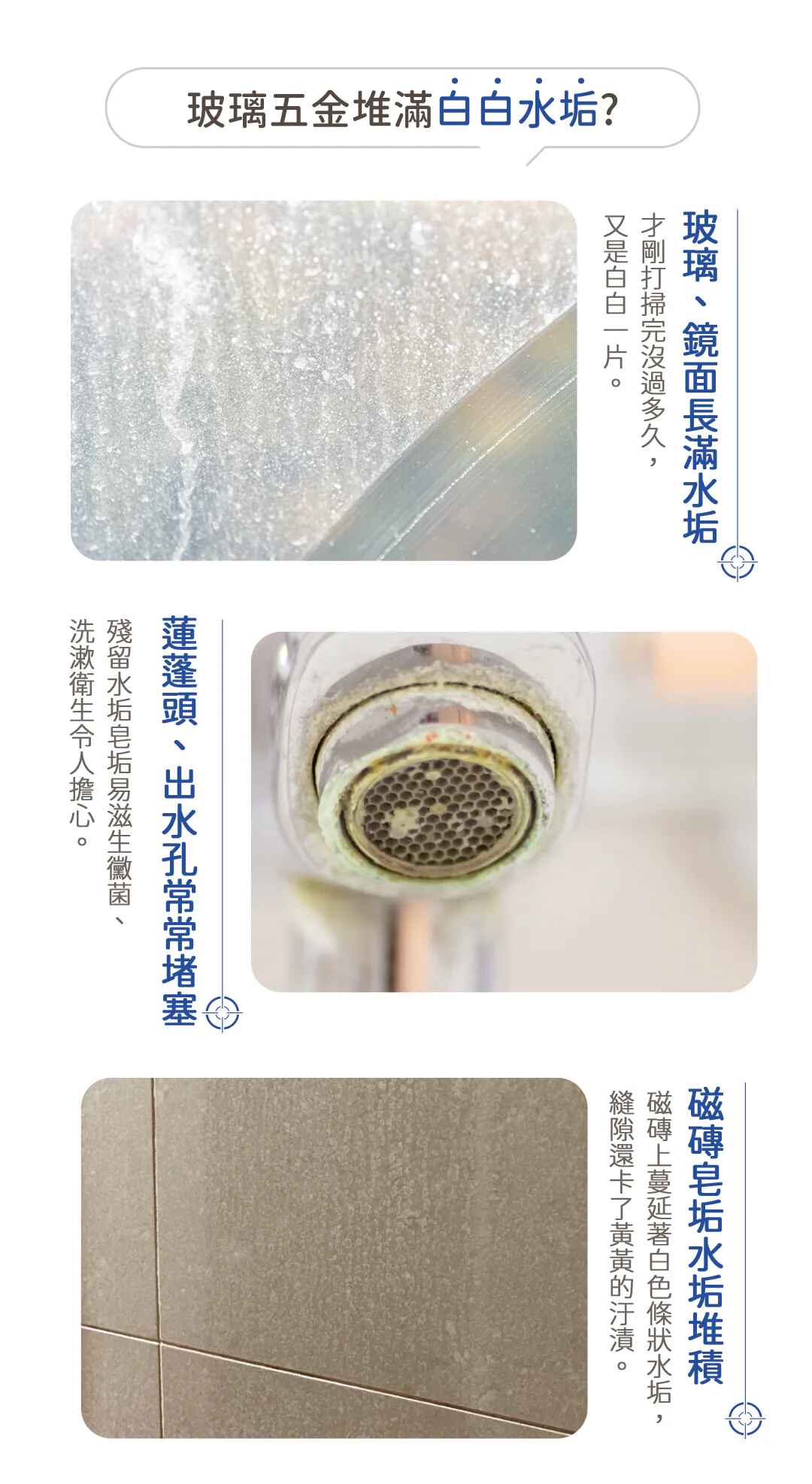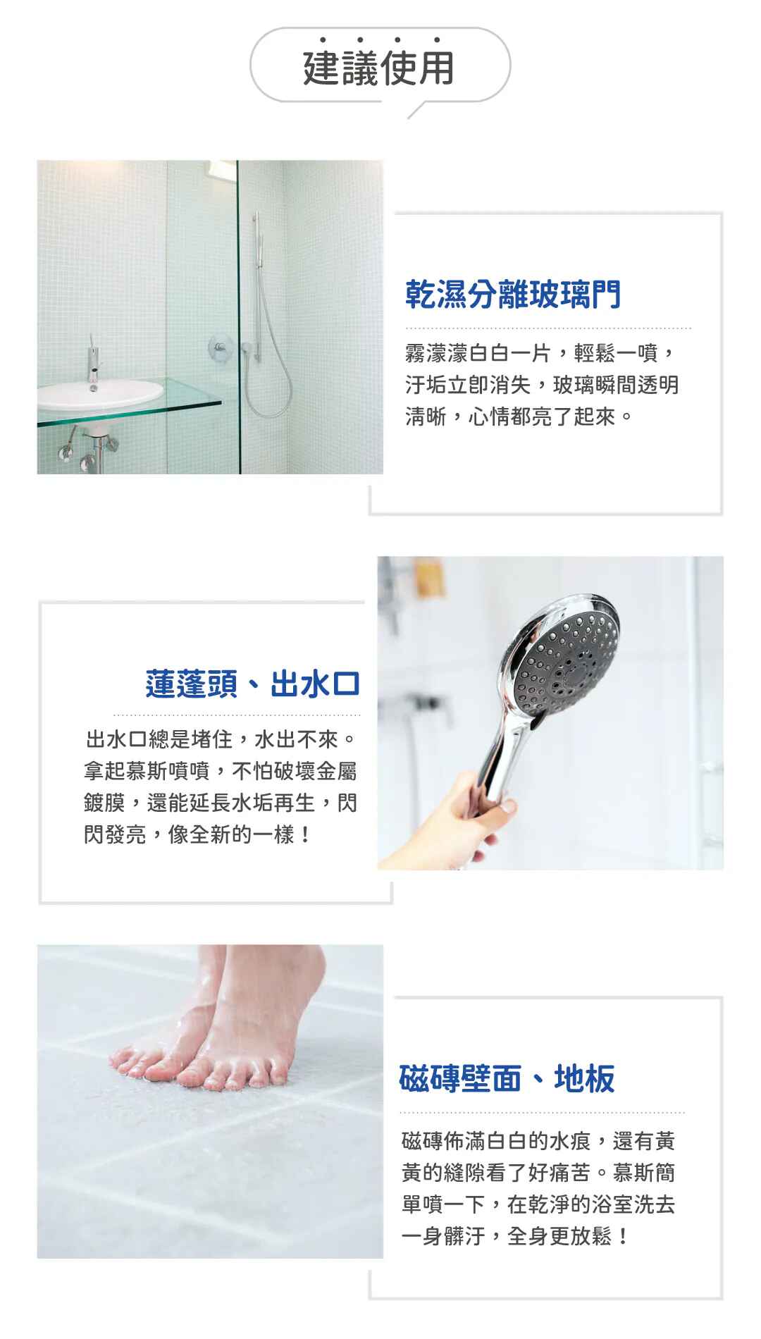 ►使用方法:《 輕微水垢 》 噴後靜置60秒,用清水沖淨即可。