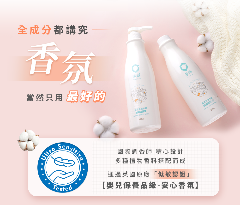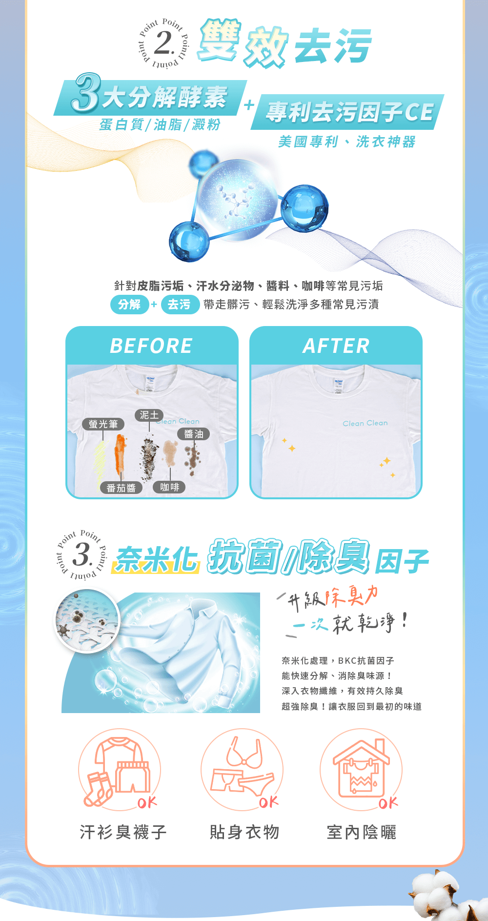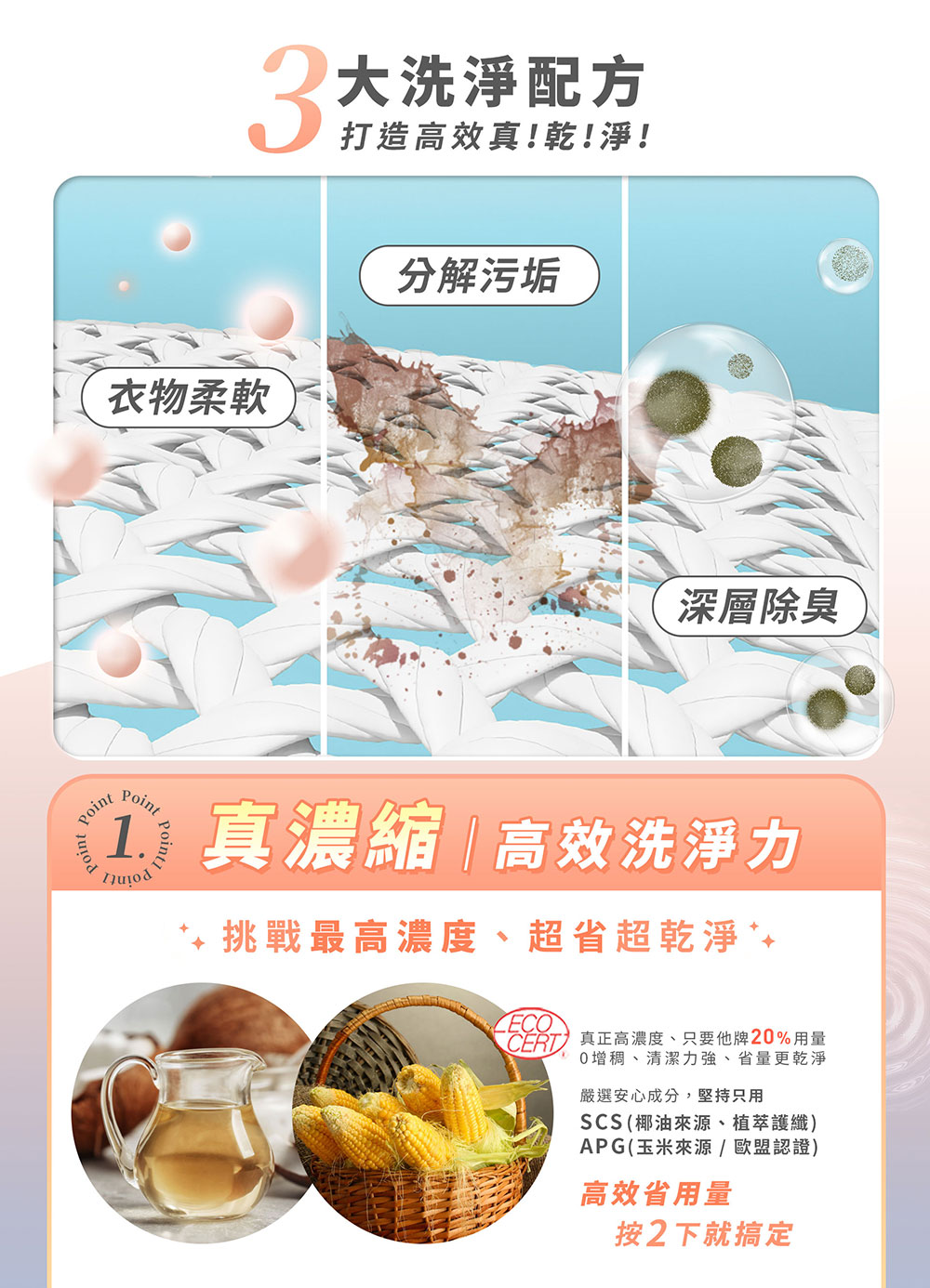 - 成分SCS椰油來源植萃護纖、APG玉米來源歐盟認證、CE美國專利去汙因子、奈米化除臭抗菌因子