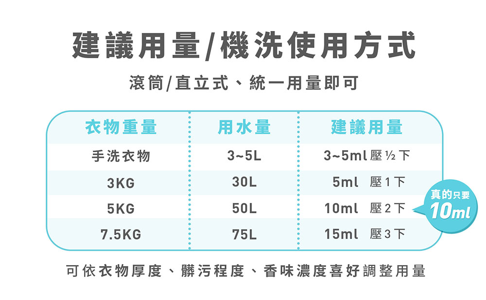 使用方式:按2下10ml洗整籃5公斤衣物,手洗用量0.5-1下即可