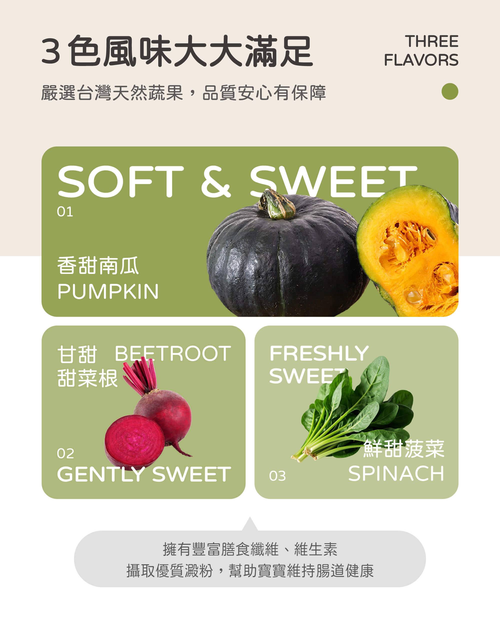 ●菠菜口味成分:小麥麵粉、菠菜、過濾水、純素沙拉油
