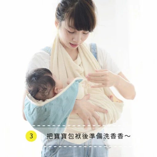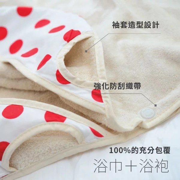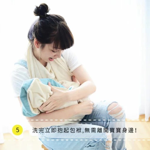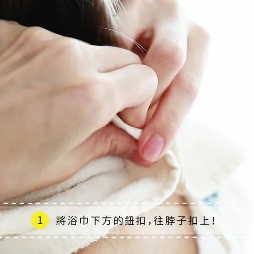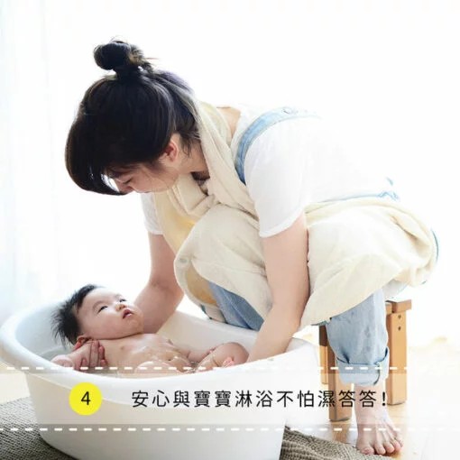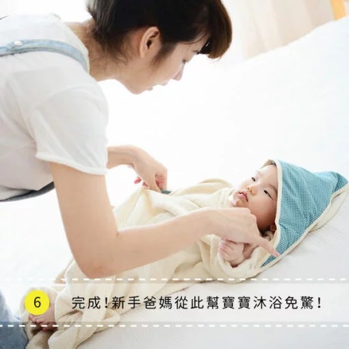 幫新生寶寶洗澡時,將小蘑菇浴巾專利扣環設計扣在脖子後方,幫寶寶洗澡浴巾不離身,不再手忙腳亂。