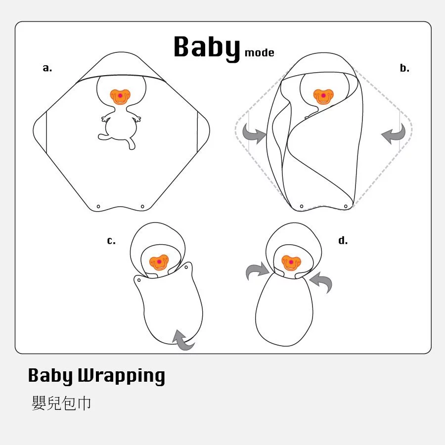 小蘑菇浴巾也可以當作新生兒包巾,依圖示包覆後,最後將專利扣環扣至寶寶脖子後方,就大功告成囉!