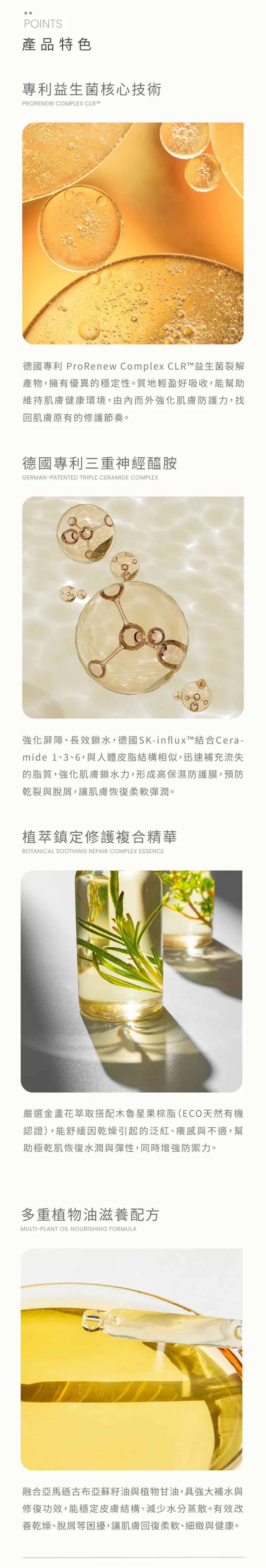 針對脆弱肌膚所研發,嚴選最安全、穩定的成分,幫助舒緩極度乾癢、乾燥及各種肌膚不適。使用高濃度德國專利益生菌技術ProRenew Complex CLR™,幫助皮膚形成穩定的結構,平衡皮膚生態的同時防止外部刺激物的侵擾;搭配SK-influx生理性脂質,提升皮膚防護力,避免水分流失;含多種養膚成分,促進肌膚修護。