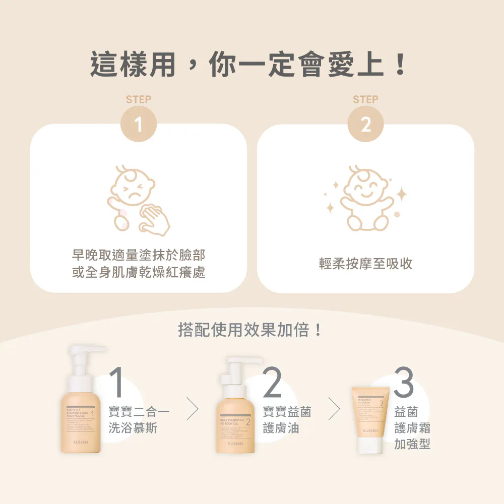 使用方法:每日早早取適量益菌護膚霜均勻塗抹於臉部或全身乾燥肌膚上,輕揉按摩至吸收,能幫助緩解乾癢。主要成分:甘油、木魯星果棕脂、金盞花萃取、亞馬遜古布亞蘇籽油 (ECO天然有機認證)