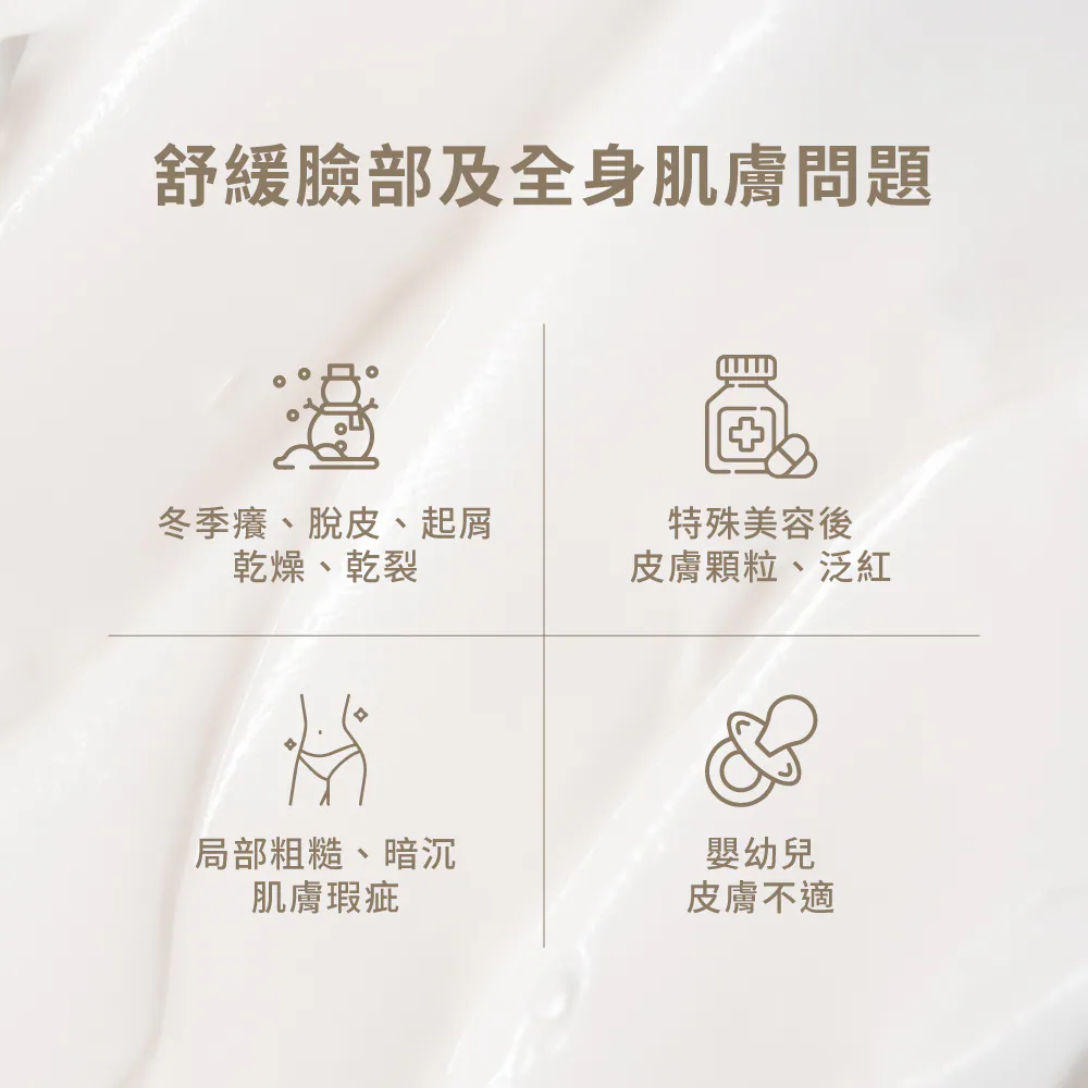 嚴選100%植物性雙甘油能減少皮膚中的水分散失,改善皮膚乾燥問題,讓肌膚變得柔軟、光滑;德國專利益生菌技術 ProRenew Complex CLR™ 和SK-influx 生理性脂質,能強化皮層屏障,隔絕有害物入侵,使肌膚獲得全面的保護。
