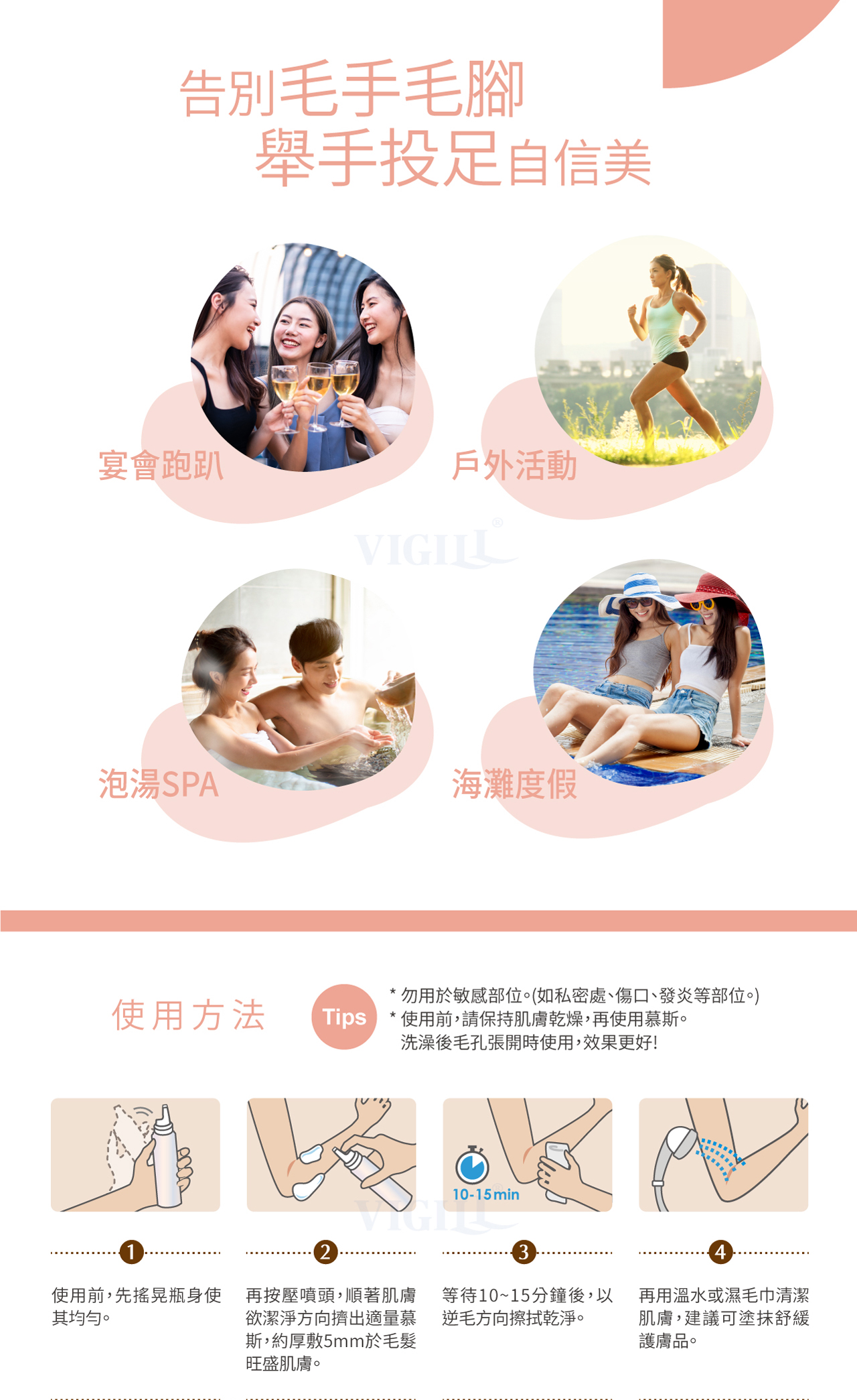 Step1·先搖一搖瓶身。 Step2·再按壓噴頭,擠出適量約厚敷5mm於毛髮旺盛肌膚。 Step 3等待10–15分鐘後,以衛生紙或毛巾逆毛方向擦拭乾淨。 Step4·再用溫水或濕毛巾清潔肌膚,建議可塗抹舒緩護膚品。