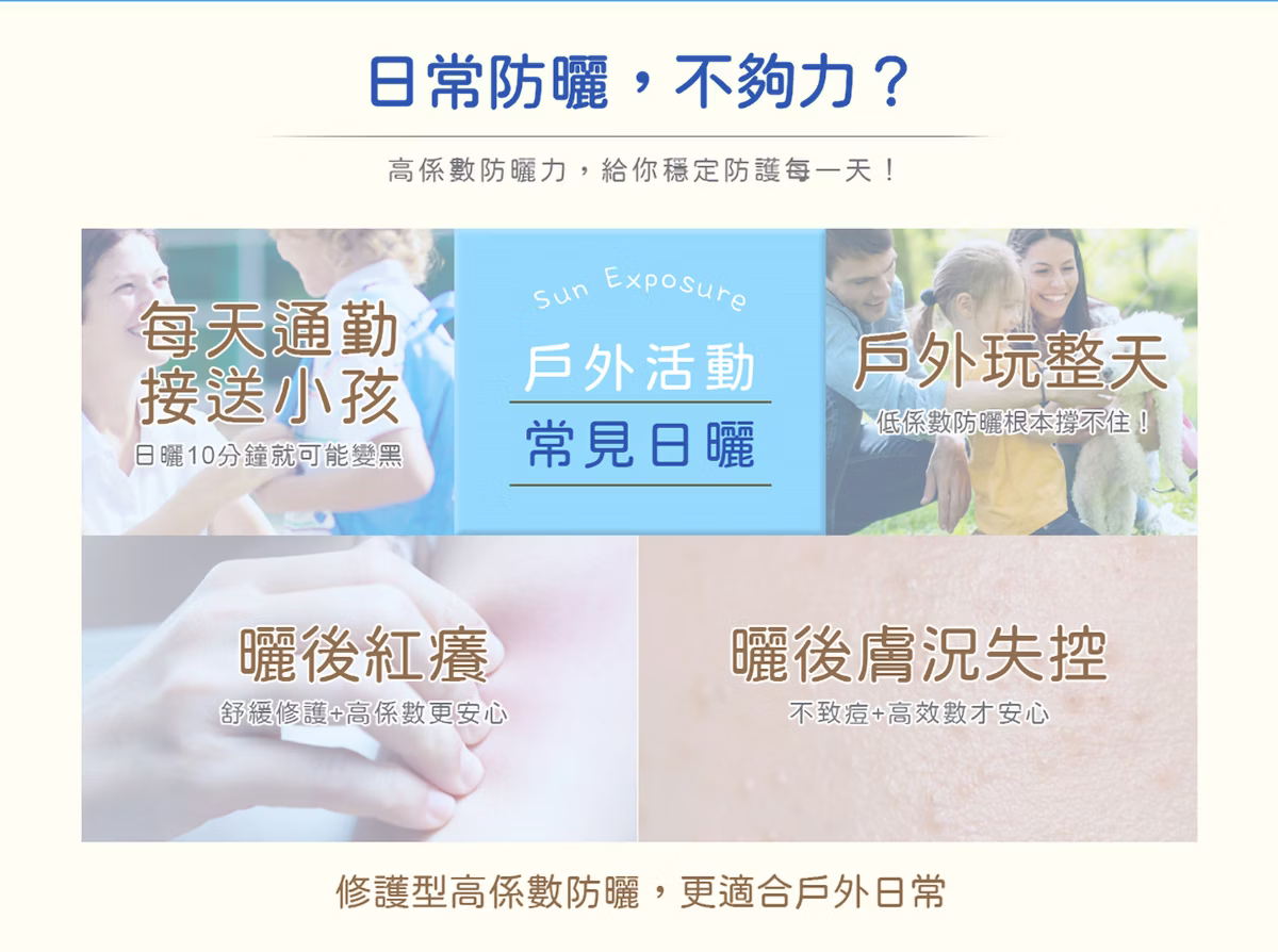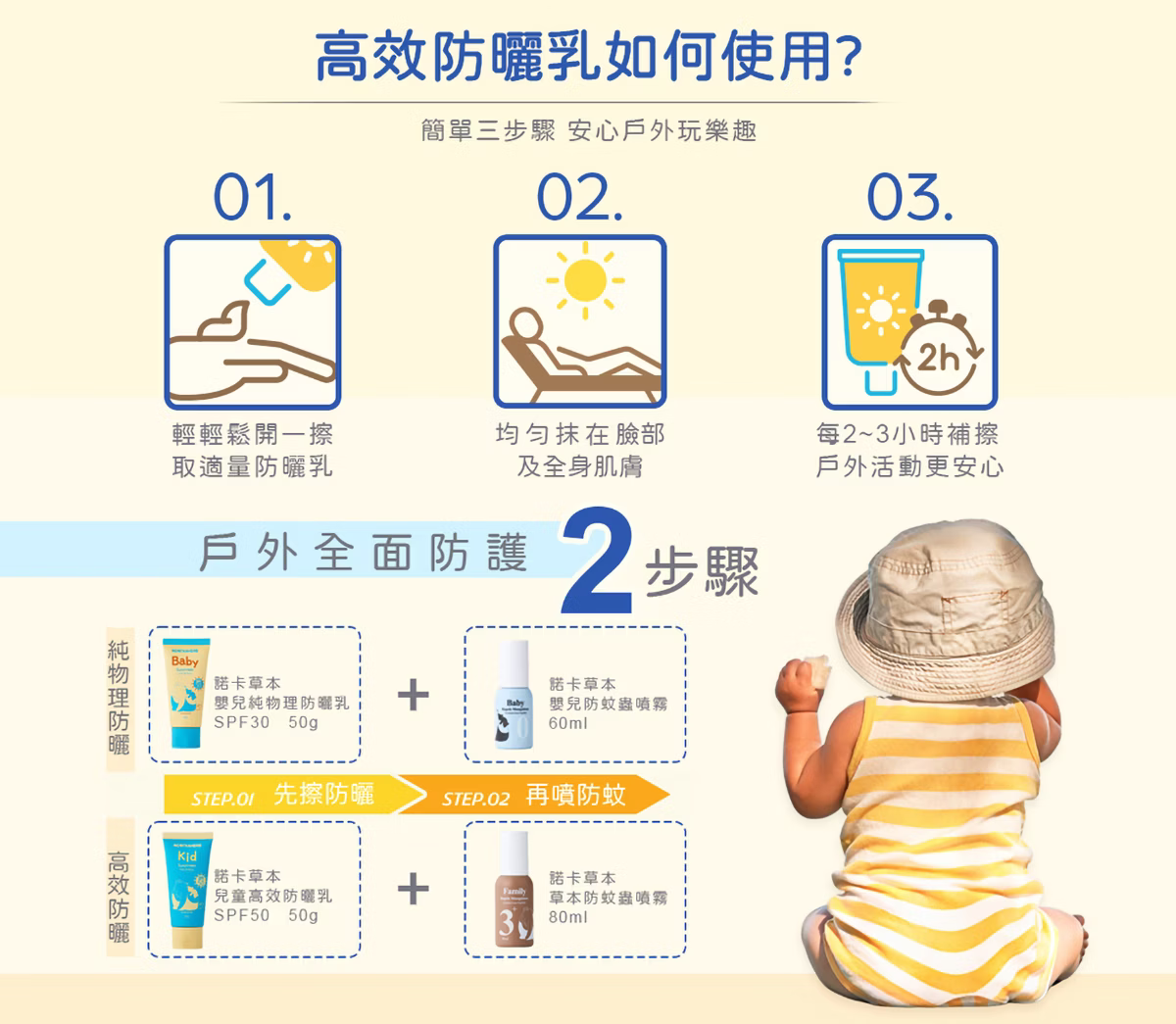 4.防曬乳因肌膚流汗、擦拭而逐漸減少,建議2~3小時補擦,以維持防曬效果