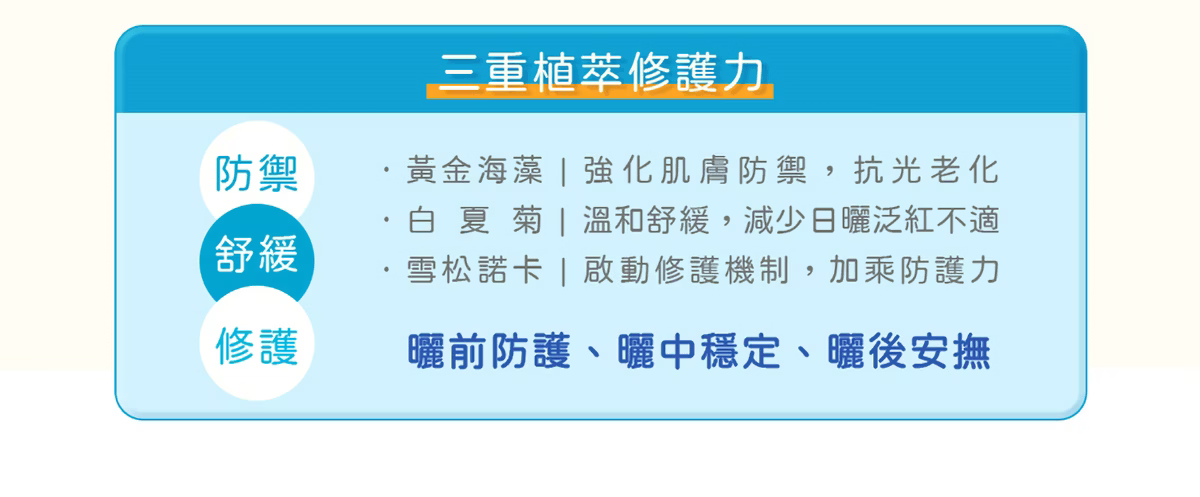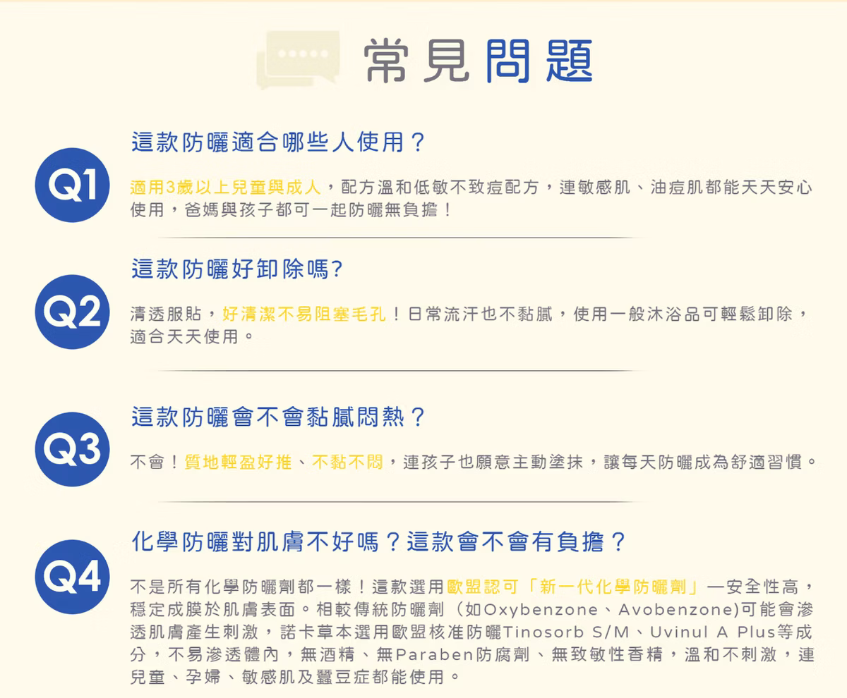 適用族群:三歲以上兒童、成人、蠶豆症、孕婦及全膚質適用