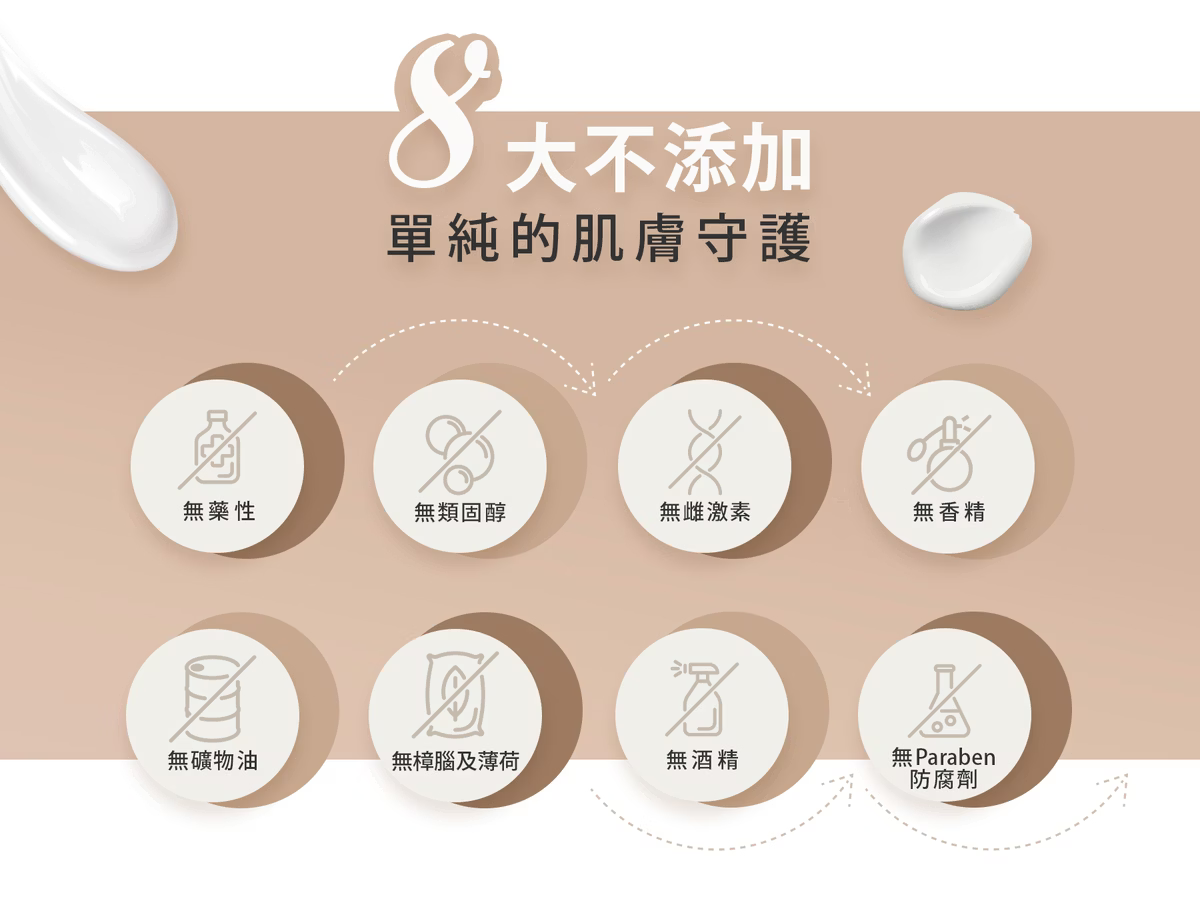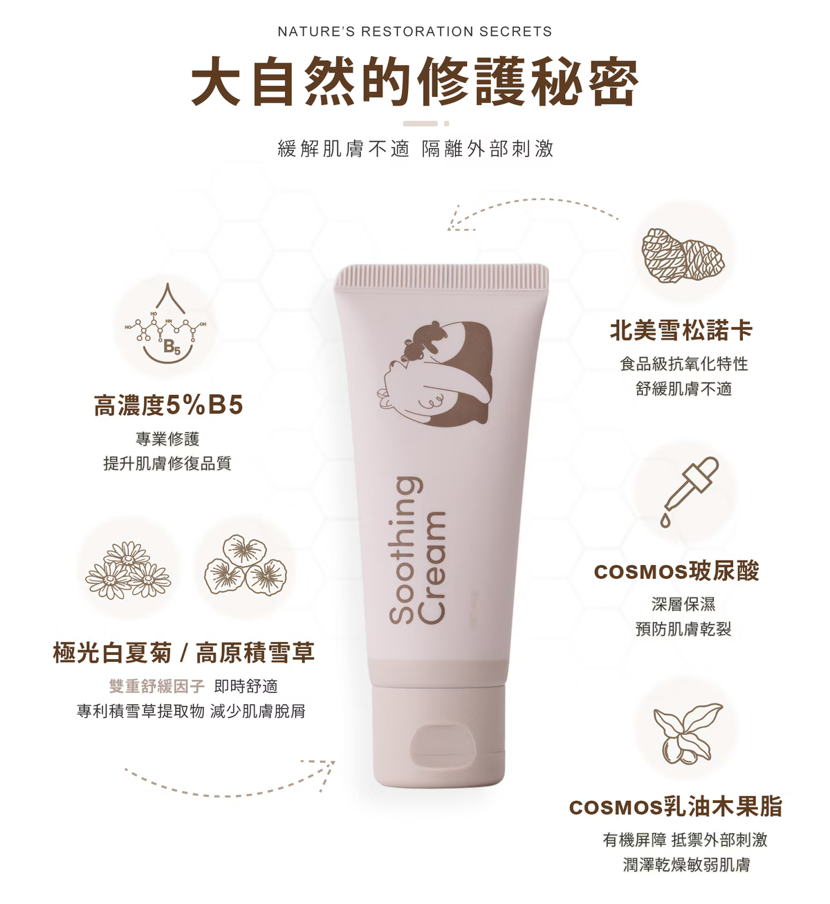 主要成分:雪松諾卡**、蜂蠟**、B5、植物油脂*(乳油木果油脂、酪梨油脂)、白夏菊*、專利積雪草、維生素E*、天然乳化劑*
