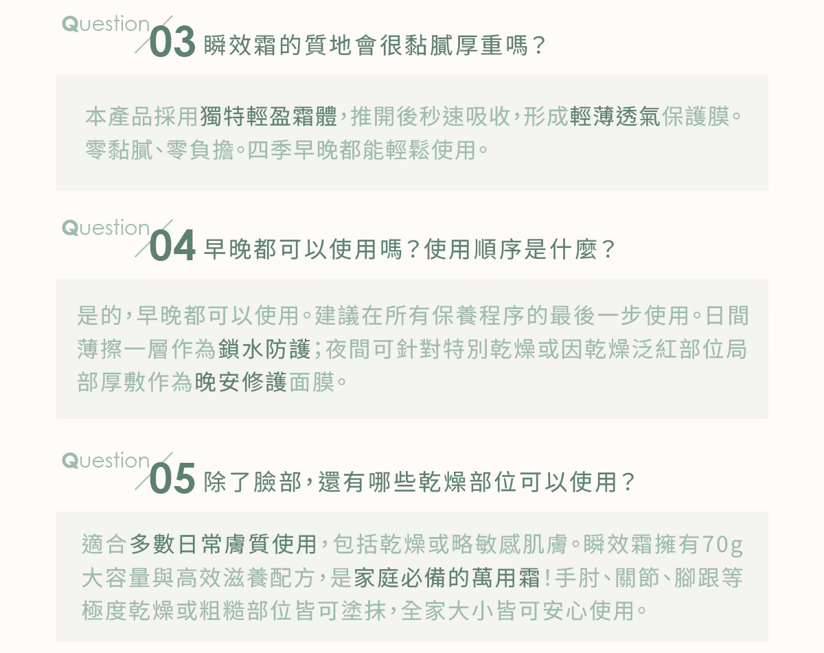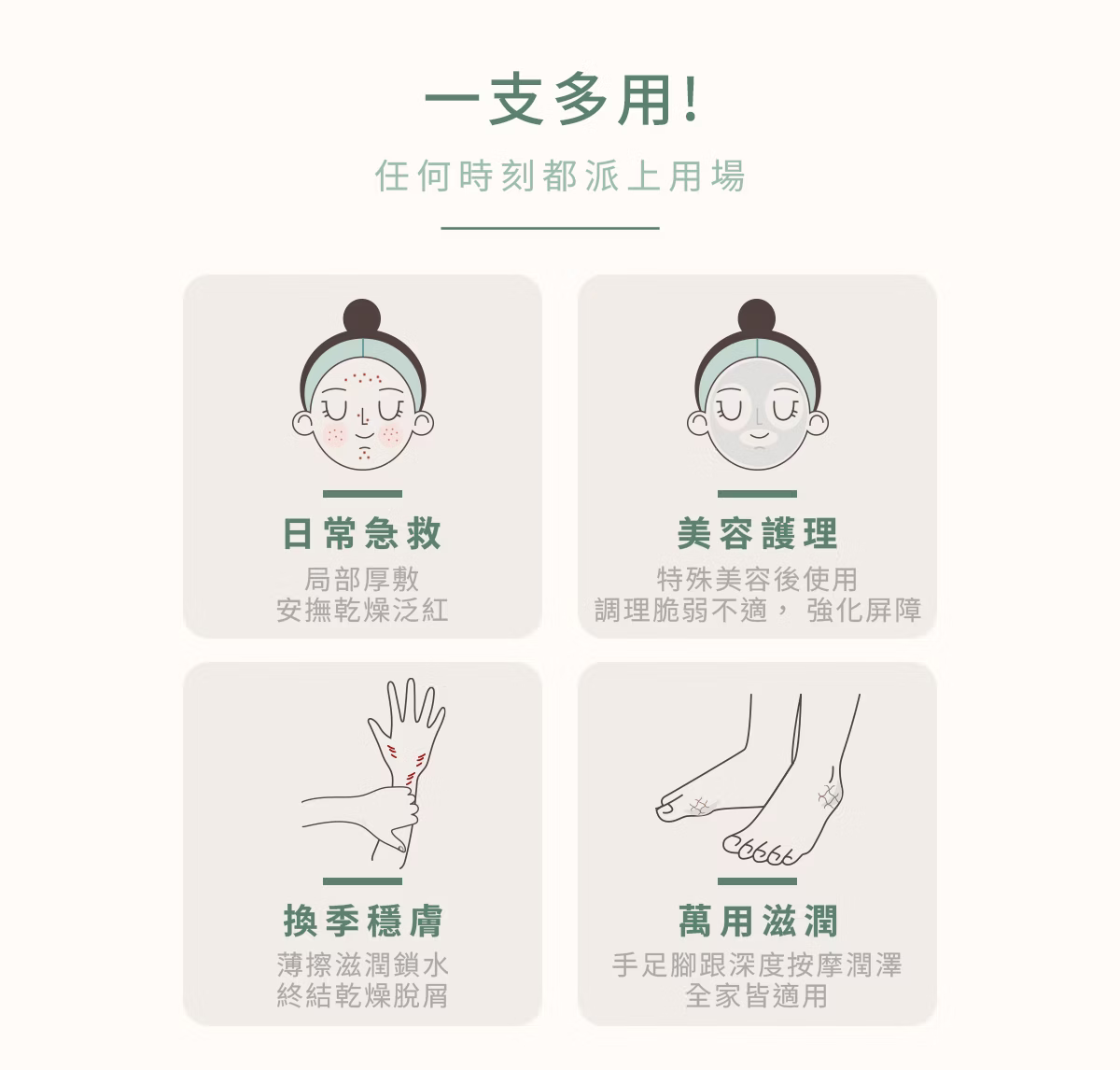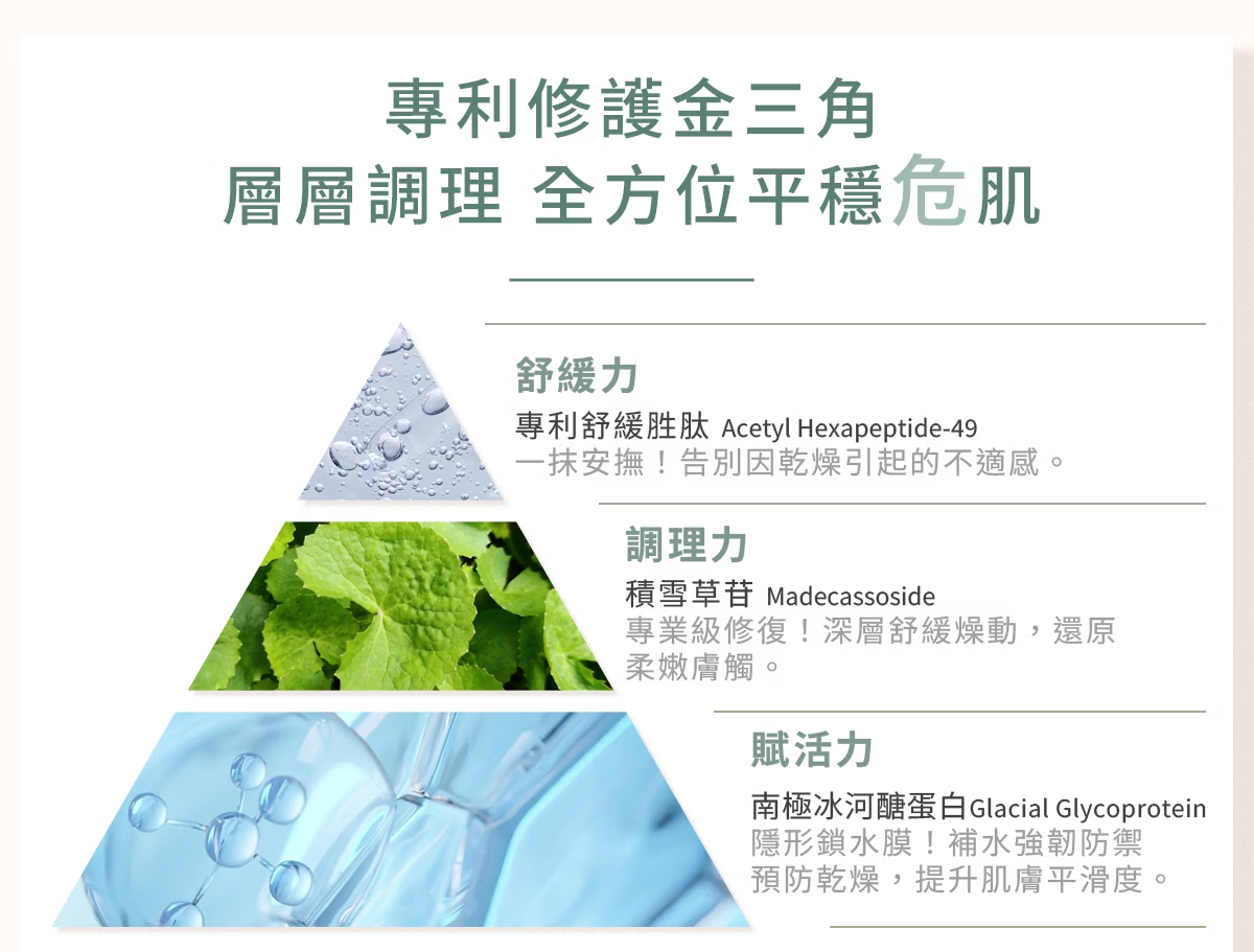 用途:適合乾燥、敏弱肌膚,於臉部及身體局部修護、舒緩及保濕使用。