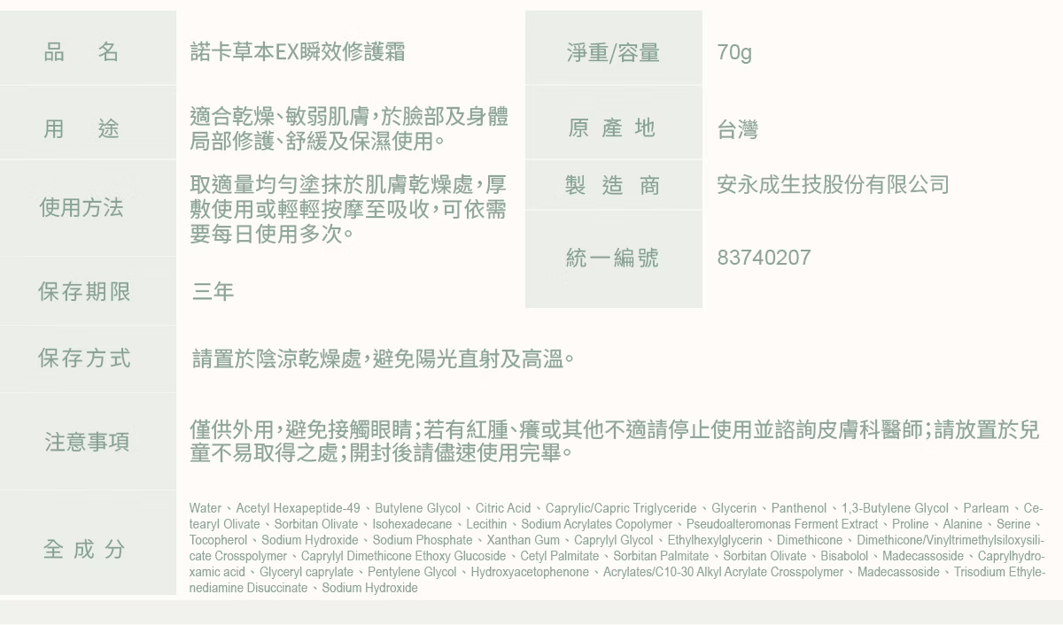 產品名稱:諾卡草本EX瞬效修護霜