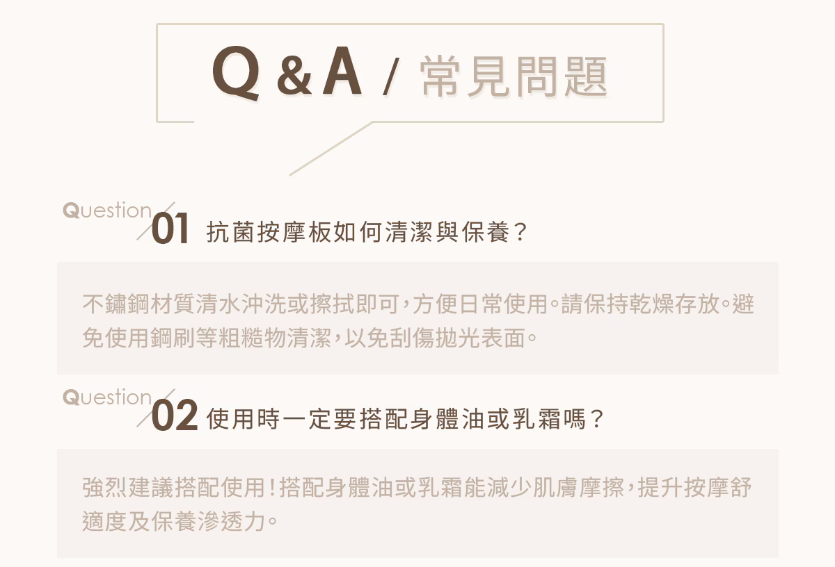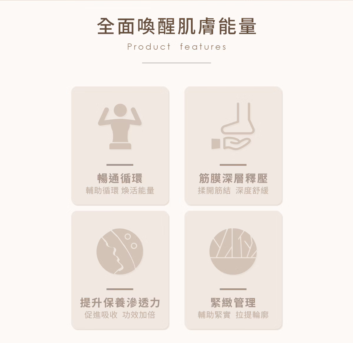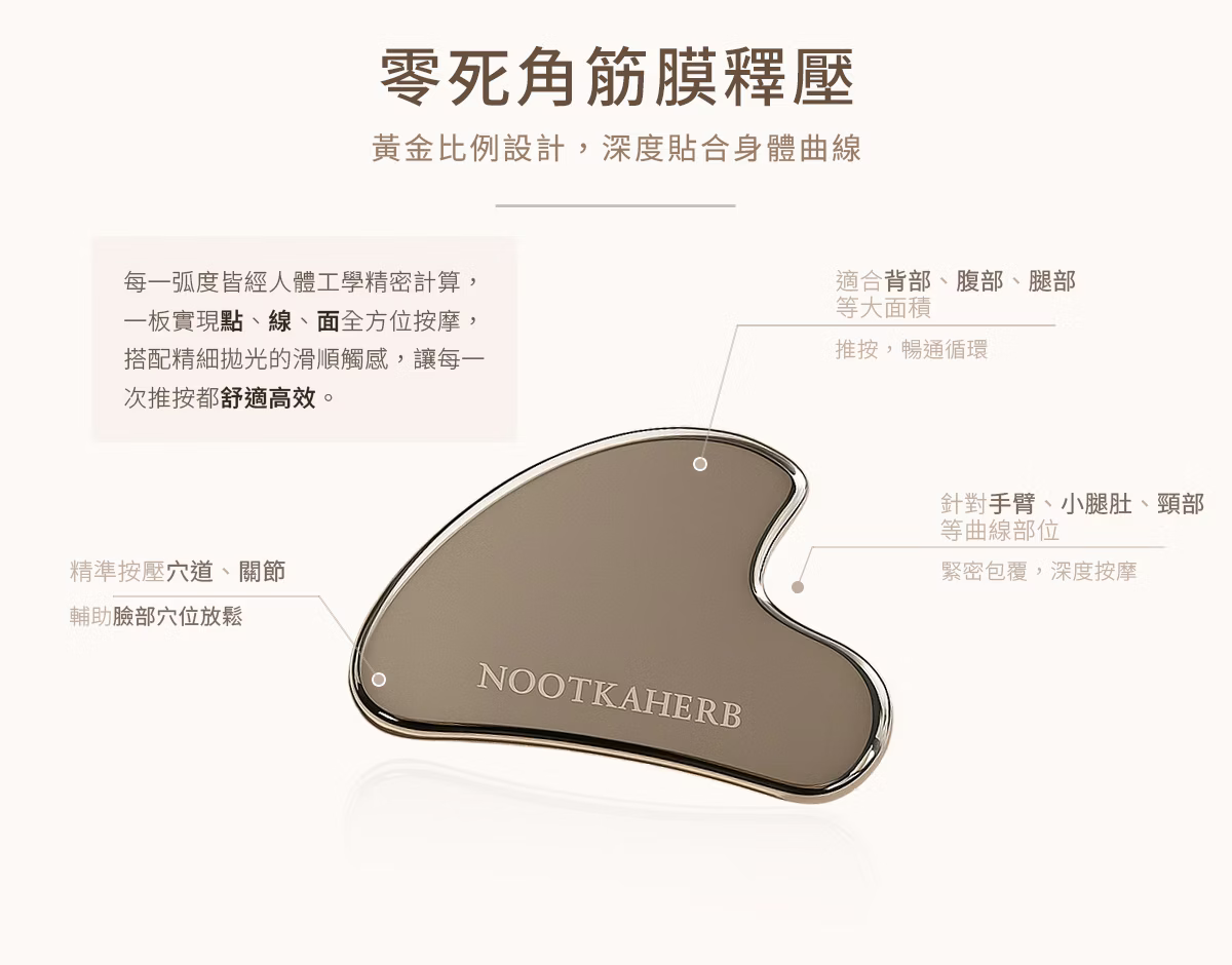 使用方式:透過按摩板的不同曲面,用於四肢,腹部及肩頸按摩刮痧使用。