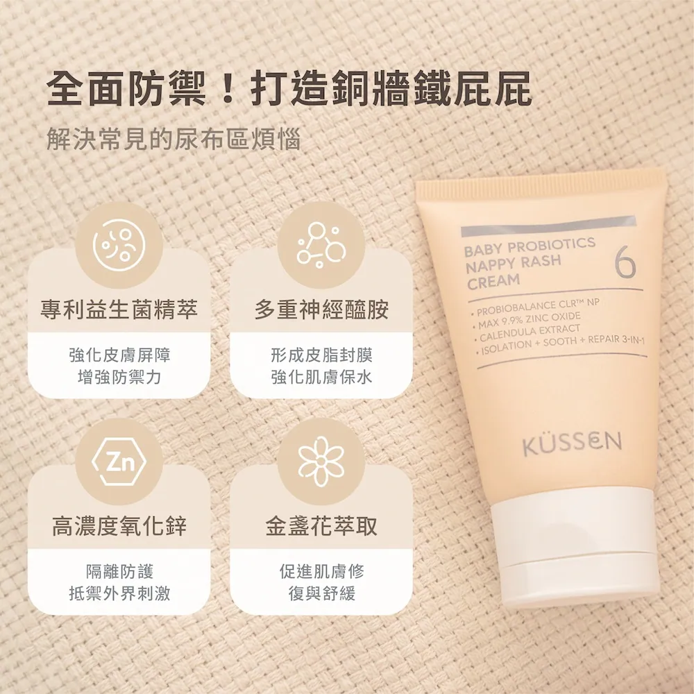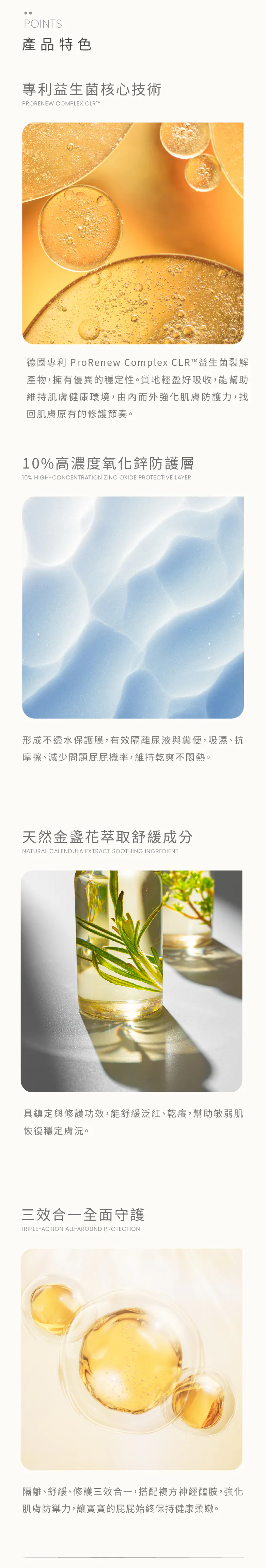 專為新生、嬰幼兒屁屁肌膚所開發之防護配方,具有隔離、舒緩、修護三重功效。9.9%高濃度氧化鋅添加,有助於形成不透水的保護屏障,隔絕皮膚與糞便、尿液的接觸,有效預防臀部周圍肌膚的不適;搭配德國專利益生菌技術及複方神經醯胺,能強化皮膚屏障,解決多種皮膚需求,讓寶寶的屁屁肌膚維持在最好的狀態。