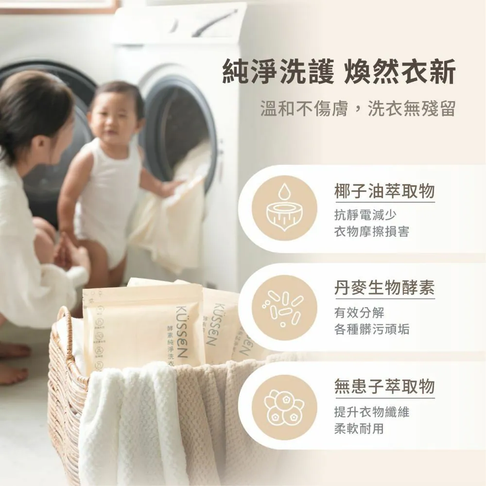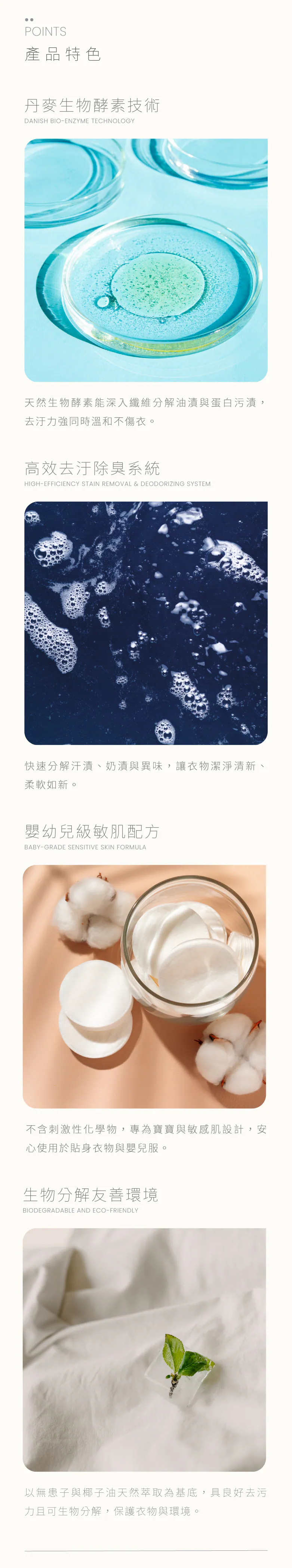 專為敏感肌族群研發,添加丹麥生物酵素,能有效去除異味、分解深層頑固髒污與殘漬 ; 植萃柔衣配方,衣物柔順、蓬鬆 ; 無添加有害化學成分,溫和、親膚、不刺激。入水即溶,衣物洗淨不殘留,全效抗菌、防蟎、守護肌膚健康。