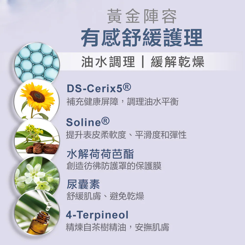 .Soline®:源自向日葵籽油的專利活性成分,有助提升皮膚柔軟度、平滑度及彈性,改善乾燥粗糙膚況。