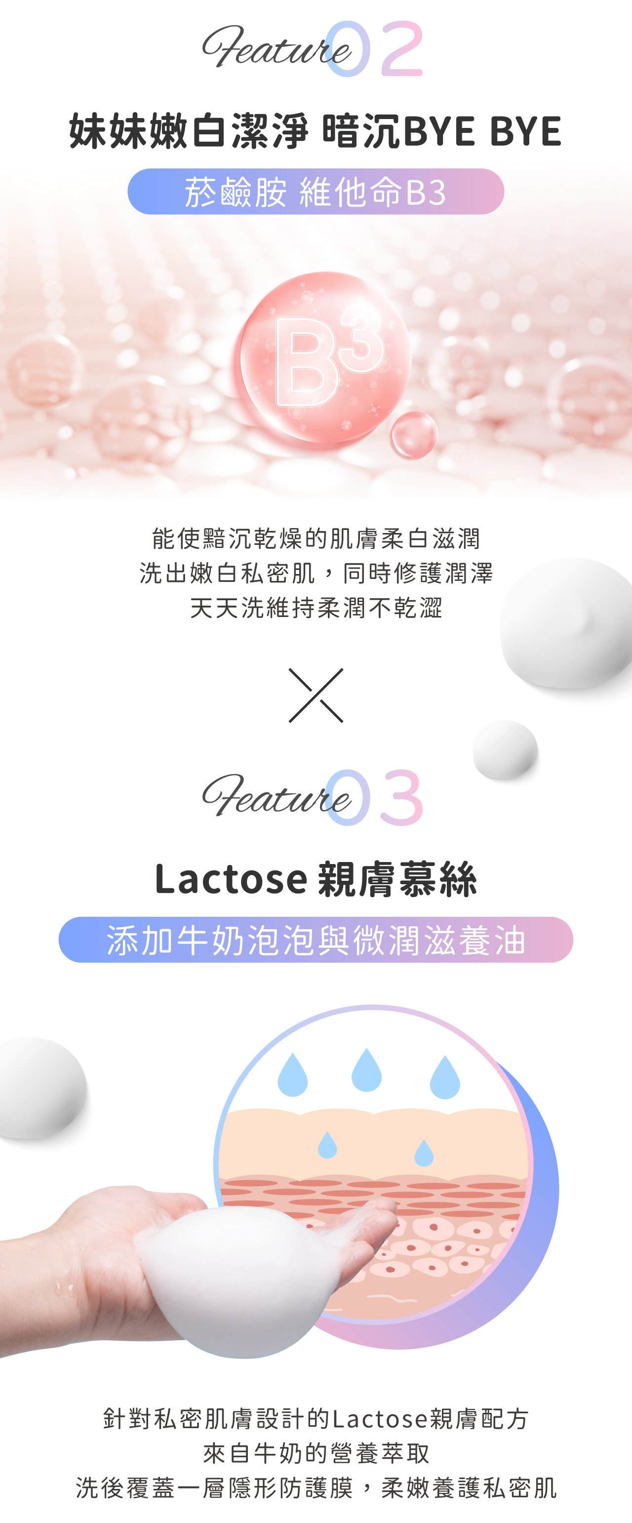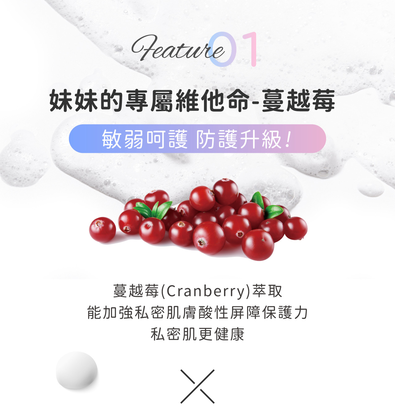 乳酸、茶樹精油、Lactose親膚配方、蔓越莓萃取、洋甘菊濃萃