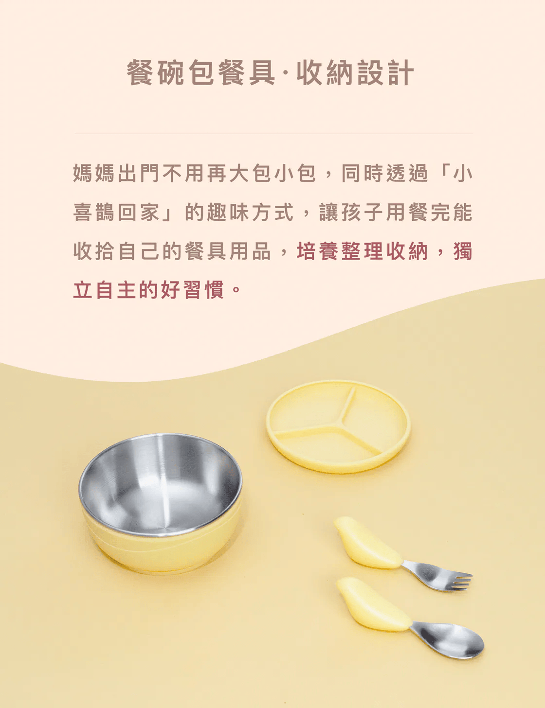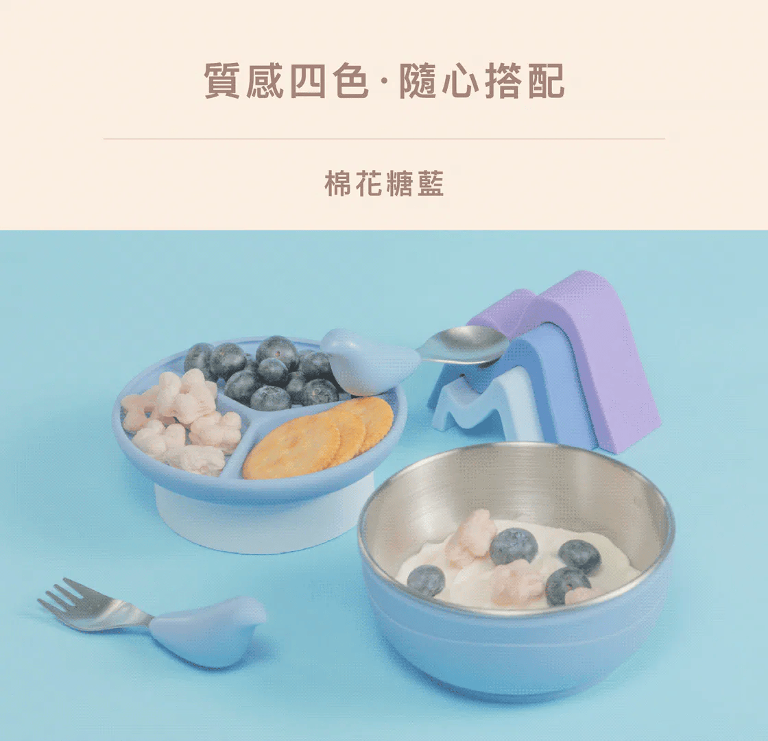 沉穩冷靜的色調有助於減緩初學用餐孩童的緊張情緒,質感四色讓每個寶貝選擇自己專屬的獨特魅力。