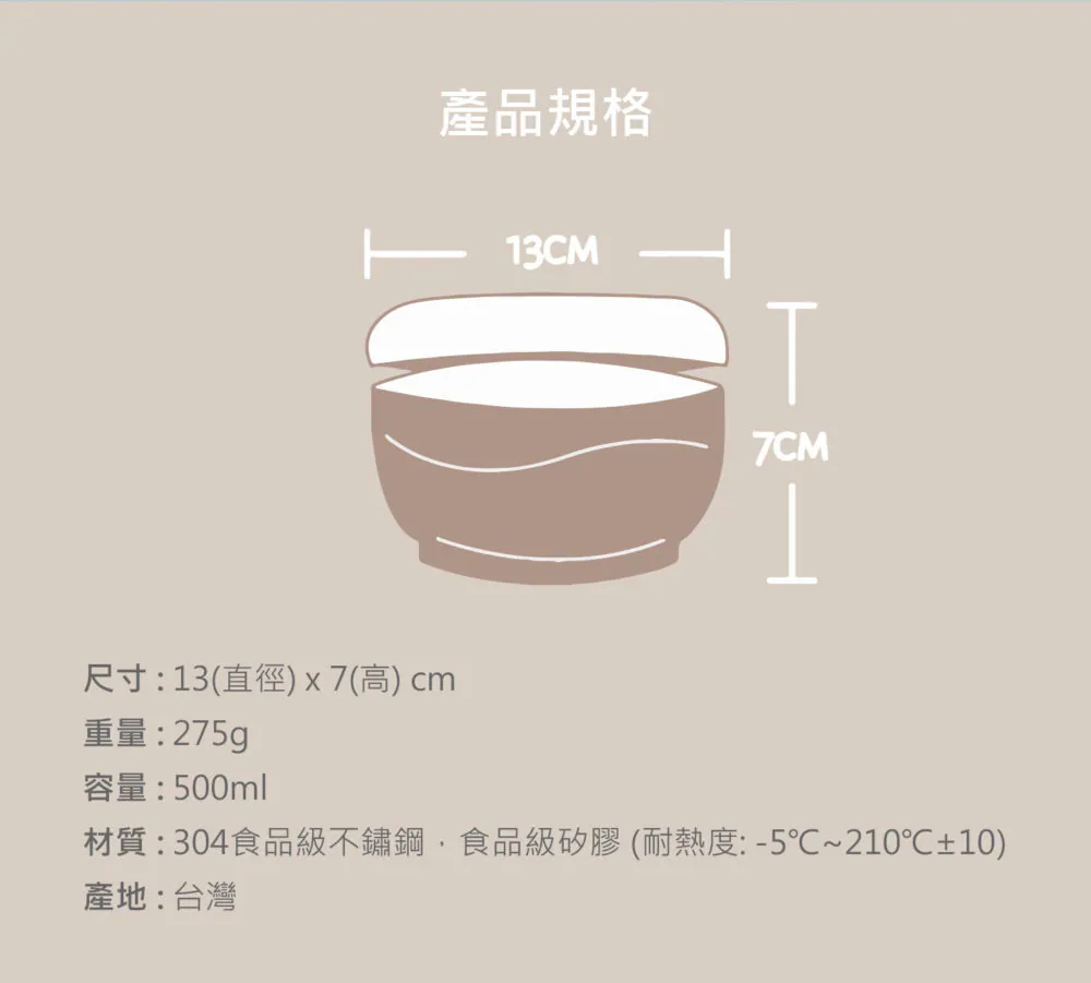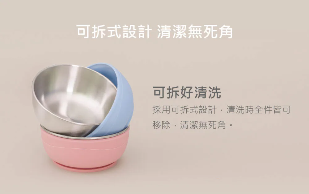 內容物:學習碗x1 (不鏽鋼內碗+矽膠防燙外碗)、矽膠分隔上蓋x1、矽膠吸盤x1