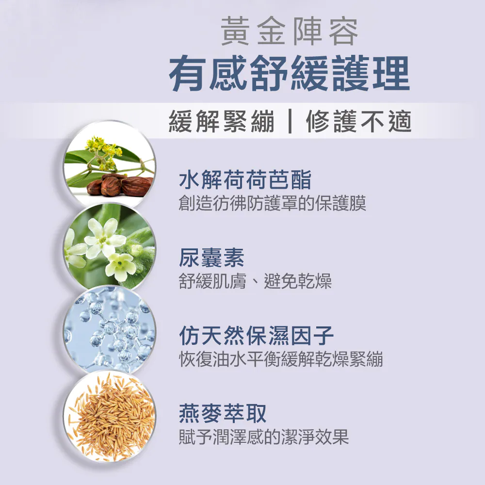 結合水解荷荷芭酯、尿囊素、仿天然保濕因子與燕麥萃取,洗後潤澤不緊繃,舒緩乾燥脫屑,從新生兒到成人都適用