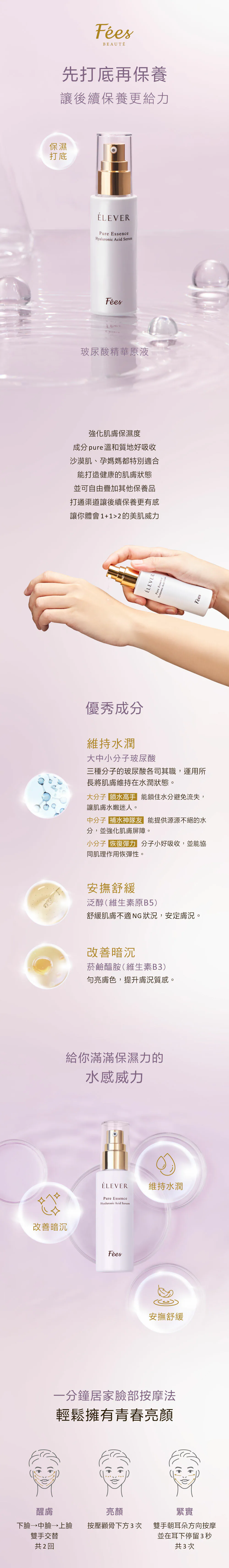 .玻尿酸:含有高分子、中分子、小分子玻尿酸,長效導入X結構式補水,層層滲透肌膚底層