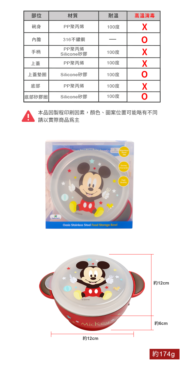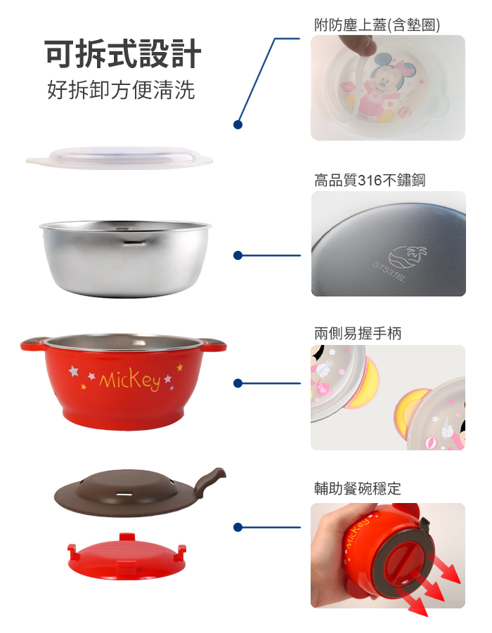 ●不鏽鋼內膽可單獨拆卸高溫消毒。碗身請勿使用洗碗機、消毒鍋及煮沸等方式消毒,可能會導致產品變形或圖案剝落。