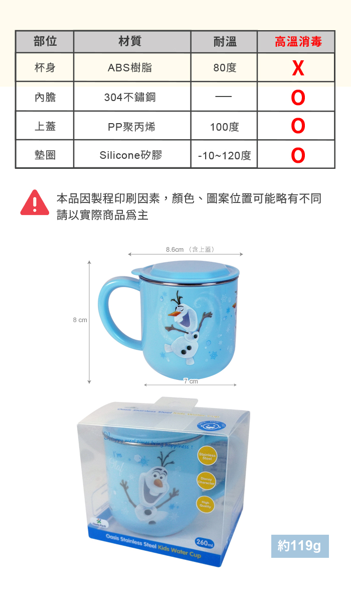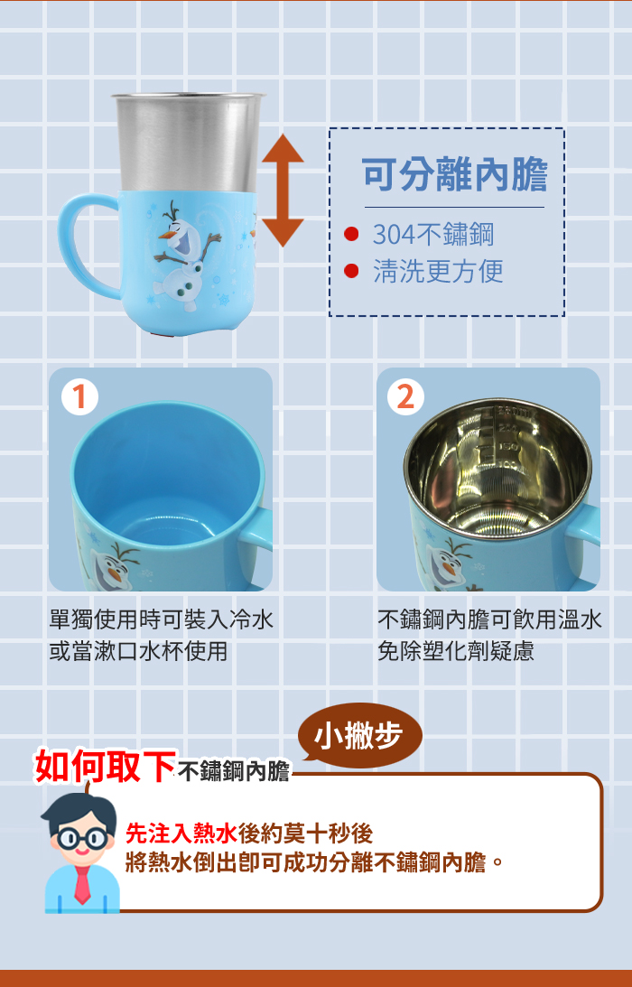 ●不鏽鋼內膽可單獨拆卸高溫消毒。杯身請勿使用洗碗機、紫外線消毒鍋及煮沸等方式消毒,可能會導致產品變形或圖案剝落。