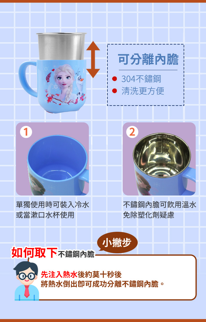 ●不鏽鋼內膽可單獨拆卸高溫消毒。杯身請勿使用洗碗機、紫外線消毒鍋及煮沸等方式消毒,可能會導致產品變形或圖案剝落。