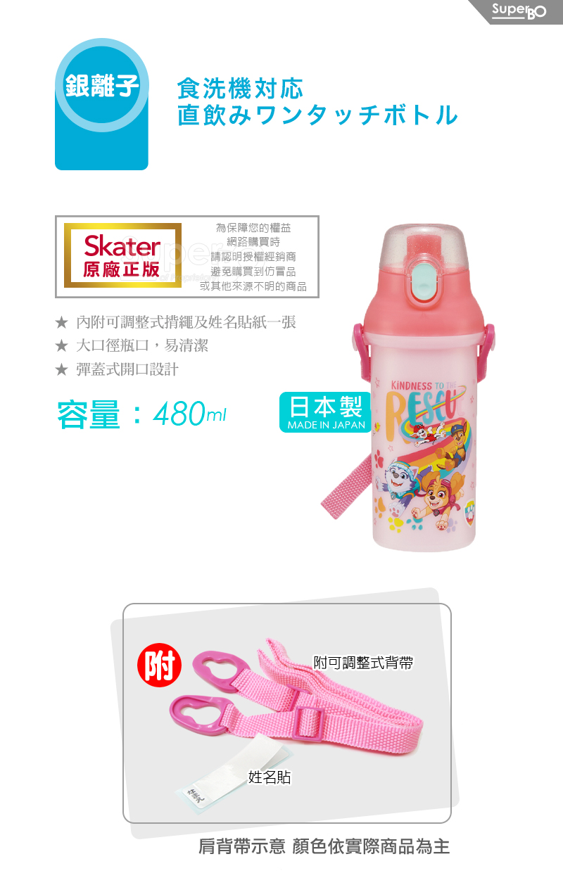 Skater 銀離子直飲水壺480ml 汪汪隊-粉