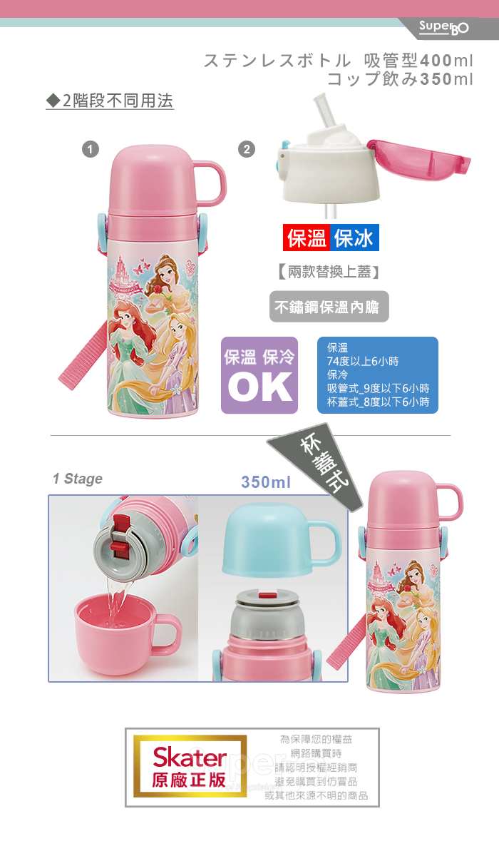 Skater 不鏽鋼保溫水壺(吸管400ml+杯蓋組) 迪士尼公主