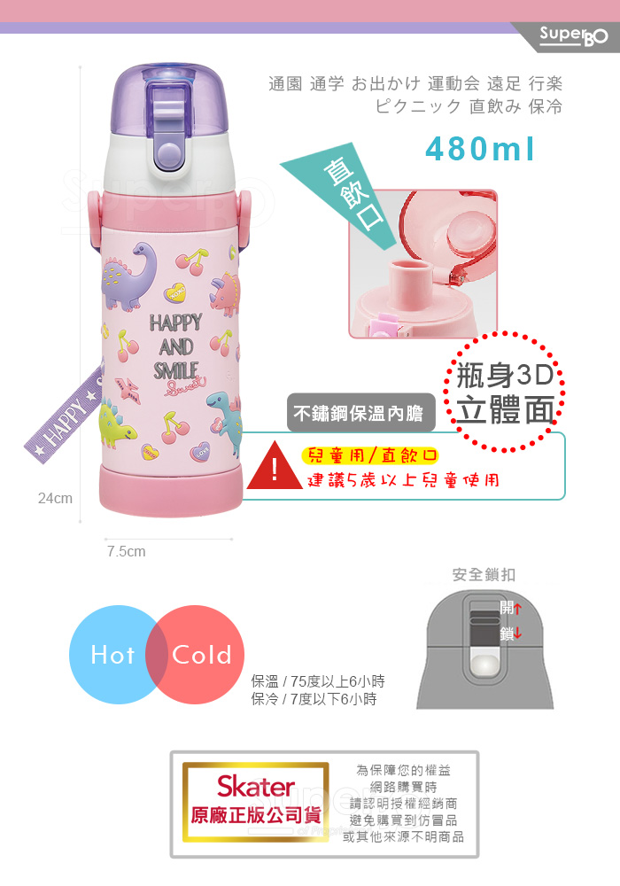 Skater 立體不鏽鋼保溫水壺480ml 粉粉龍