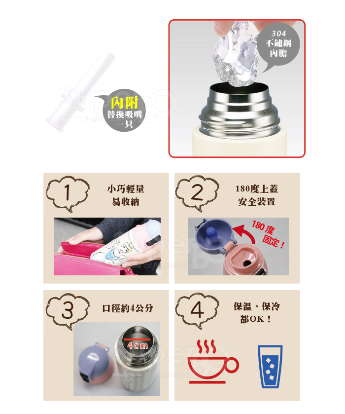 4.雙層真空不鏽鋼容器,皆具有保冷保溫功能,吸管型水壺,切勿注入高溫飲品,因環境溫差壓力可能會導致飲品溢出。