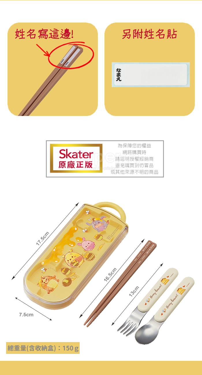 ◆三件式組,內容物:湯匙x1.叉子x1.筷子x1,內附姓名貼紙一張。