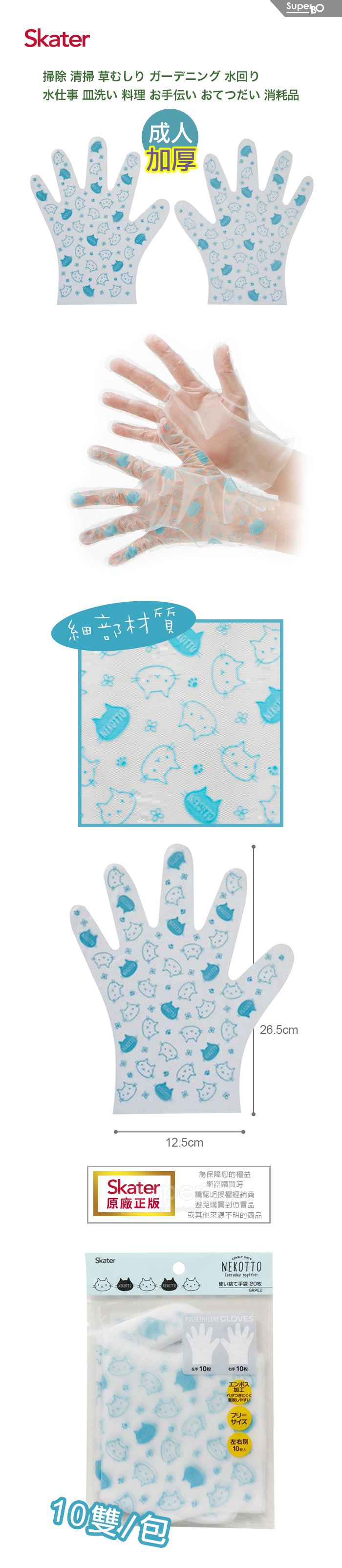 ◆成人用拋棄式手套。◆加厚設計。◆做料理、烤肉、野餐適用。材質:聚乙烯尺寸:約26.5cm入數:20入(左右手各10入)產地:中國1、請遠離火源。2、此品為日本原裝,包裝密實,拆封後無法復原,請確認所需後再請購買。