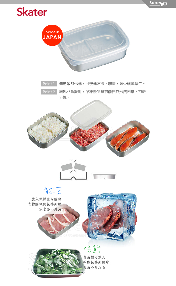 ◆傳熱散熱迅速,可快速冷凍、解凍,減少細菌孳生。◆底部凸起設計,冷凍後的食材能自然形成凹槽,方便分塊。◆日本製造。材質:本體/鋁 上蓋/EVA樹脂/60度容量:500ml尺寸:約15.7x11.5x4.4 cm 產地:日本注意事項1、請以海綿清洗,勿用鋼刷或硬質物洗滌,以免刮傷。2、此品為原裝進口,若拆封後無法復原,請確認所需後再請購買。