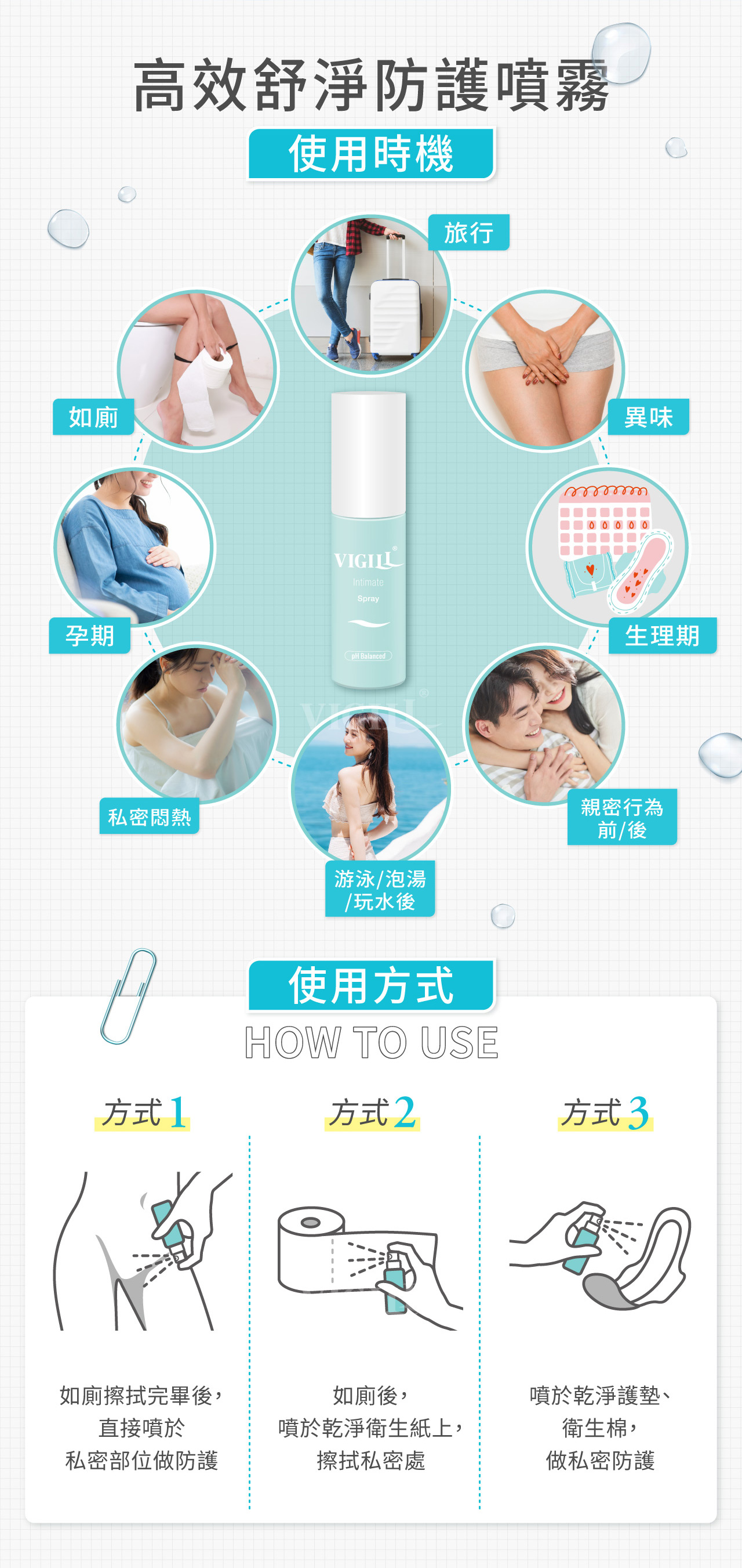 如廁後,輕噴數下於私密處, 不需再以清水沖洗