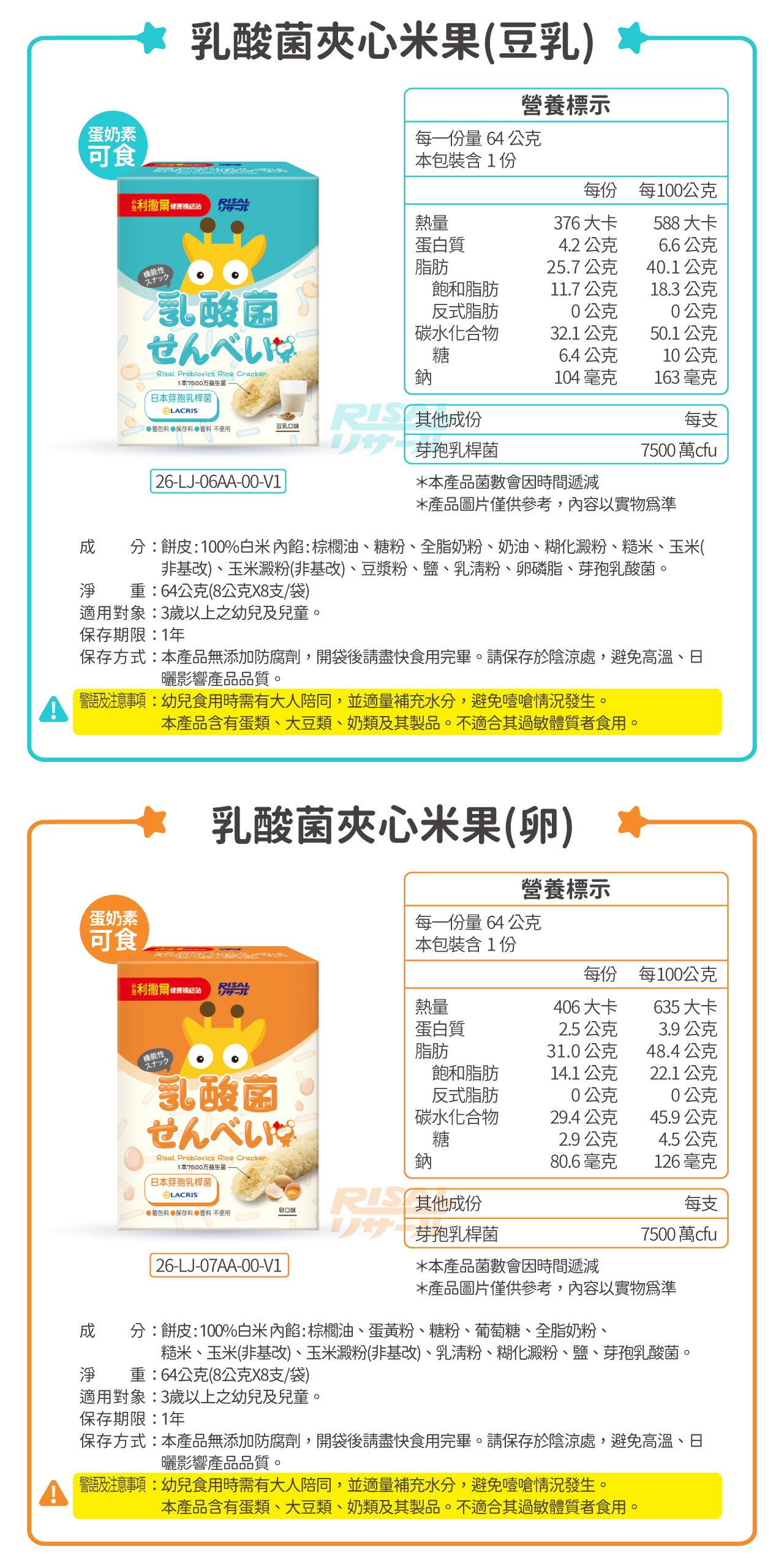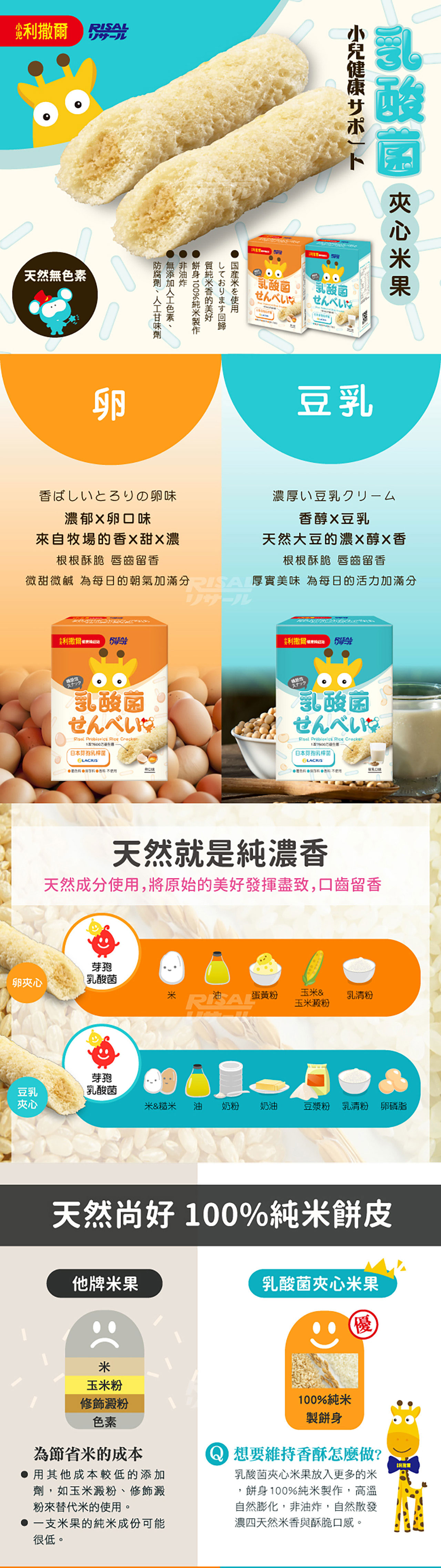 白米(100%)、棕櫚油、糖粉、全脂奶粉、奶油、糊化澱粉、糙米、玉米非基改、玉米澱粉非基改、豆漿粉、鹽、乳清粉、卵磷脂、芽孢乳酸菌