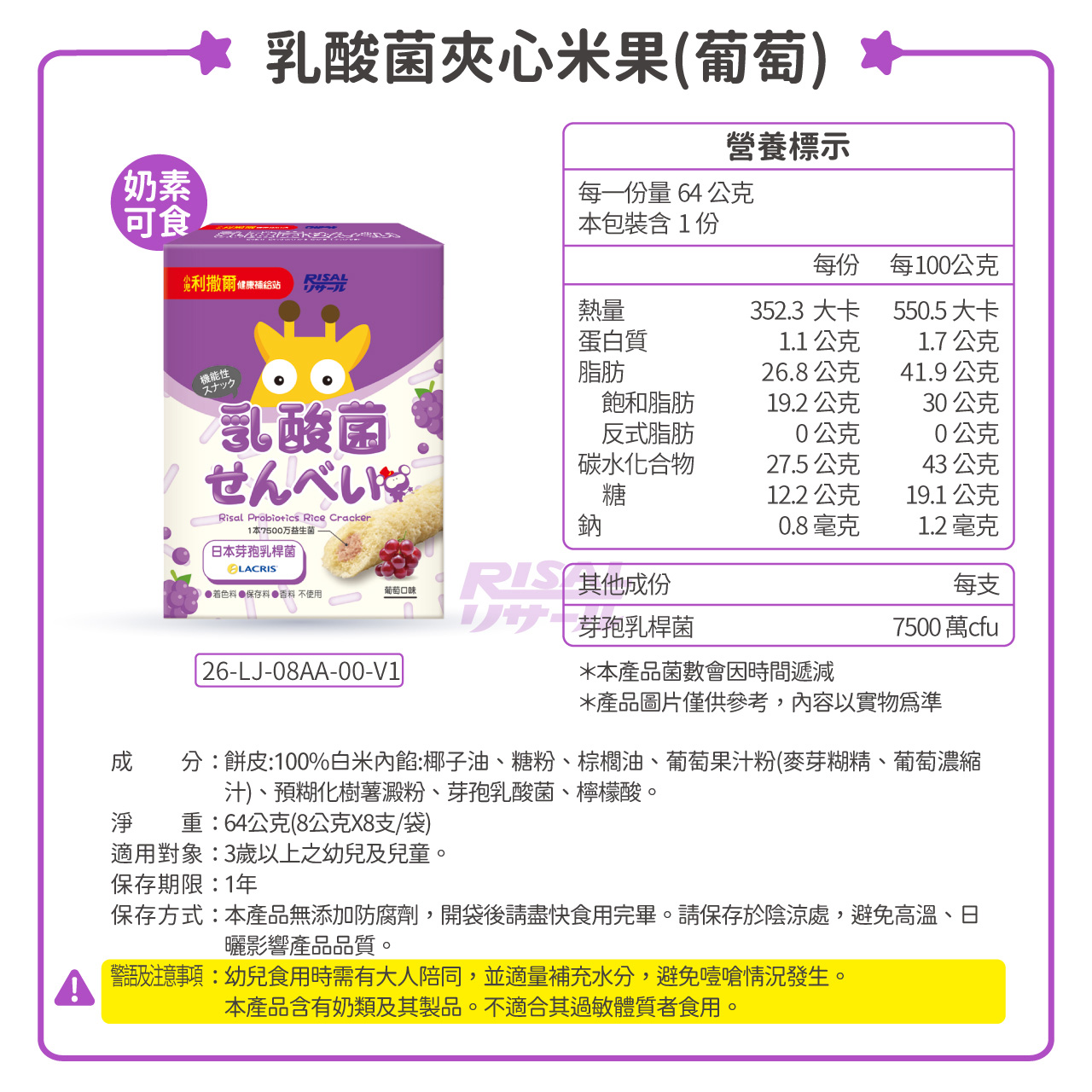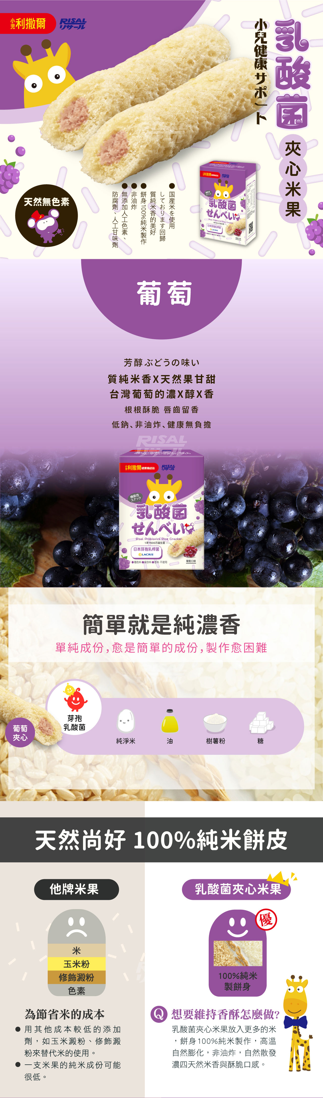 餅皮: 白米(100%) 內餡:椰子油、糖粉、棕櫚油、葡萄果汁粉麥芽糊精、葡萄濃縮汁、預糊化樹薯澱粉、芽孢乳酸菌、檸檬酸