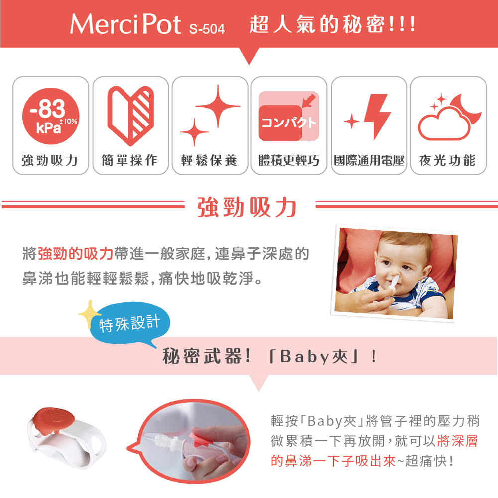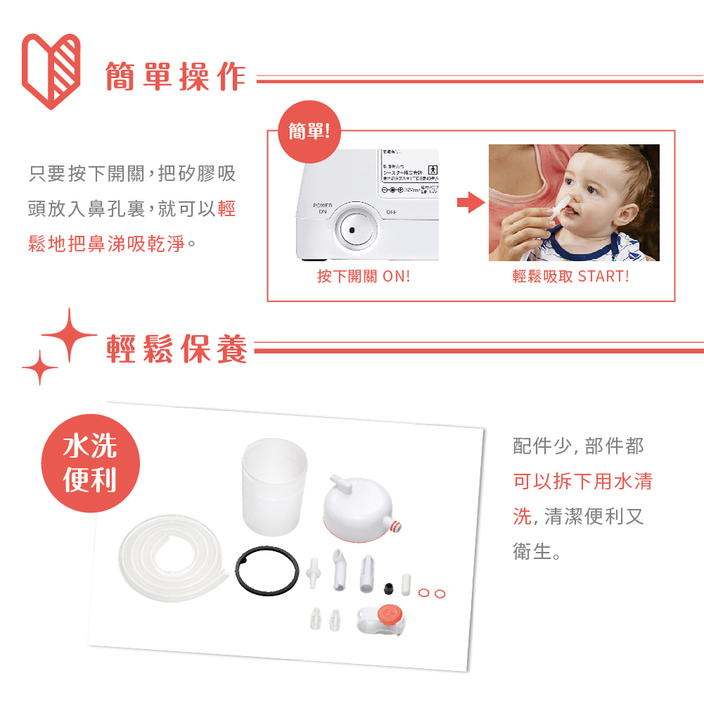 內容物:吸鼻器機身*1、專用AC變壓器*1、吸取用軟管*1、軟管阻氣夾*1、