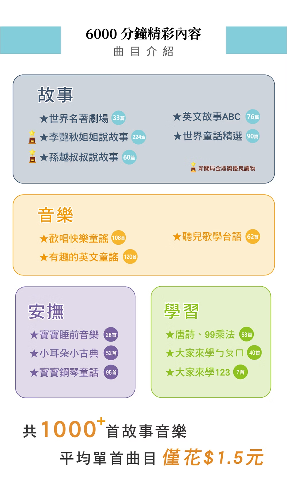 豐富的曲調架構及創造性的旋律,充分灌溉孩子的心靈,幫助幼兒在學習階段重要的關鍵期,開啟全方位的智能學習。