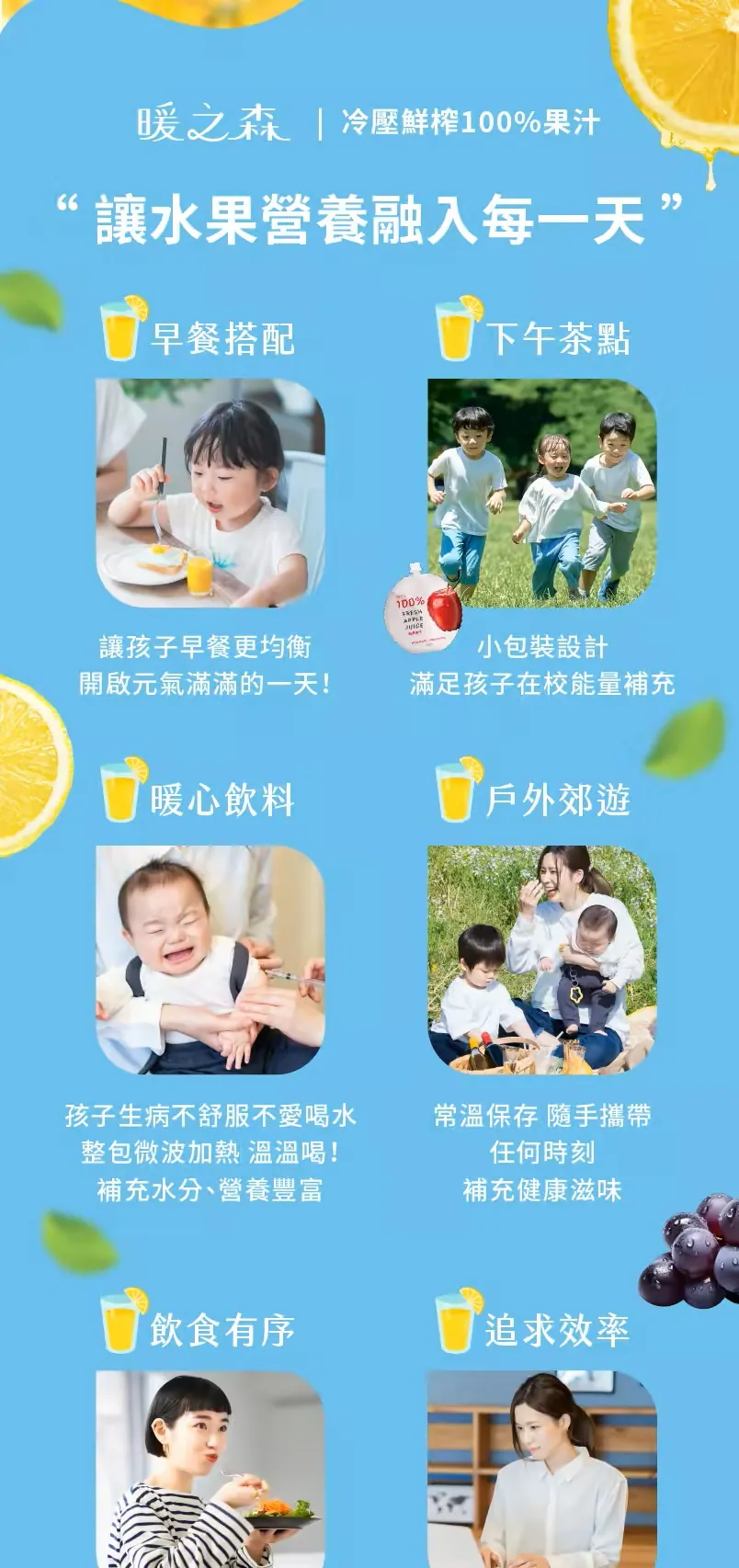 A4:暖之森100%果汁採用了完全無添加的製作方式,沒有任何防腐劑或人工成分,