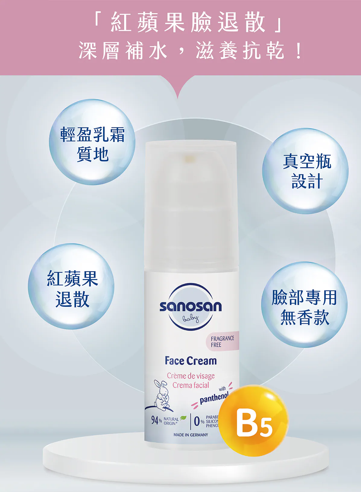 倒取適量於手中,均勻塗抹於寶寶臉部,特別適合於乾燥氣候使用。