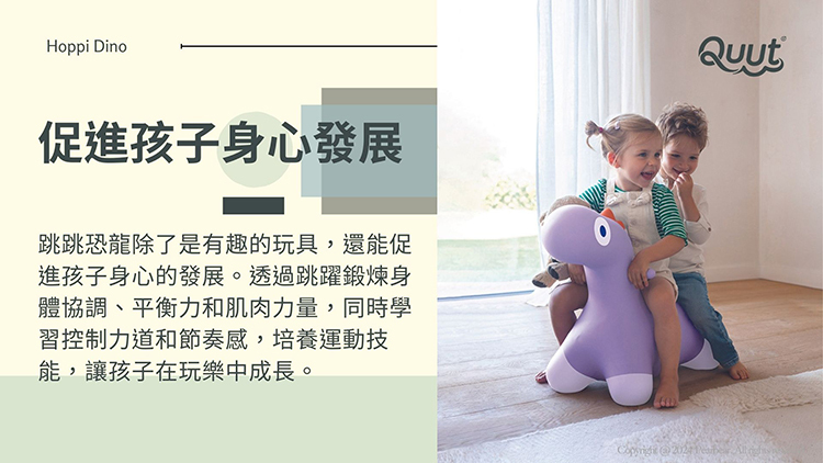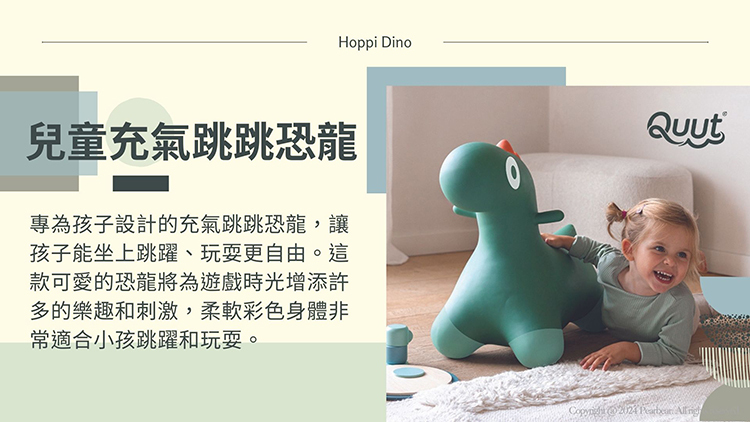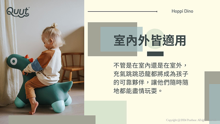 兒童充氣跳跳恐龍(花園綠)。兒童充氣跳跳恐龍,跳上去,抓住耳朵,出發啦!專為孩子設計的彈性跳跳恐龍!這個可愛的恐龍將為遊戲時間增添額外的樂趣和刺激。它柔軟又豐富多彩的身體非常適合小孩跳躍和玩耍。這個跳躍夥伴還有助於提高創造力、平衡力、協調能力和肌肉力量。無論是在室內還是在室外,跳跳恐龍都將成為孩子的可靠夥伴。
