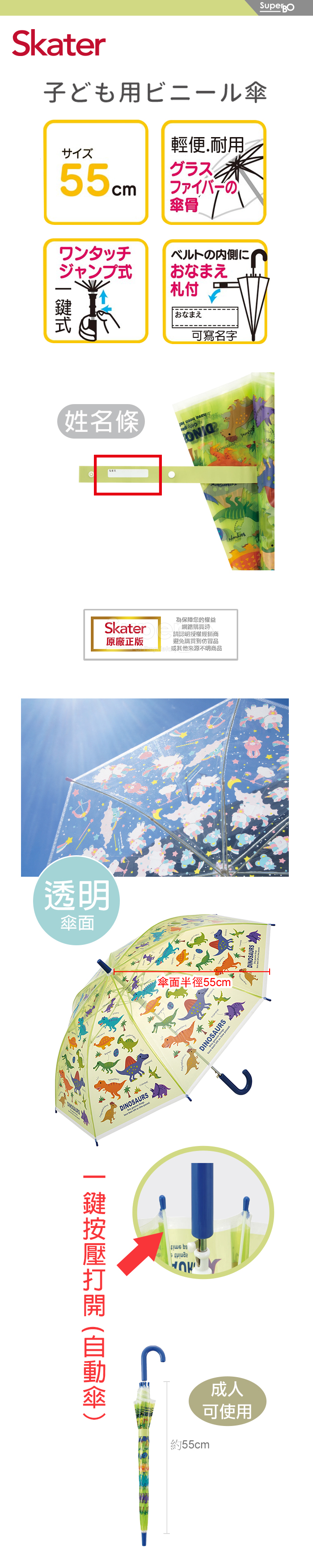 Skater 透明雨傘(55cm) 恐龍圖鑑