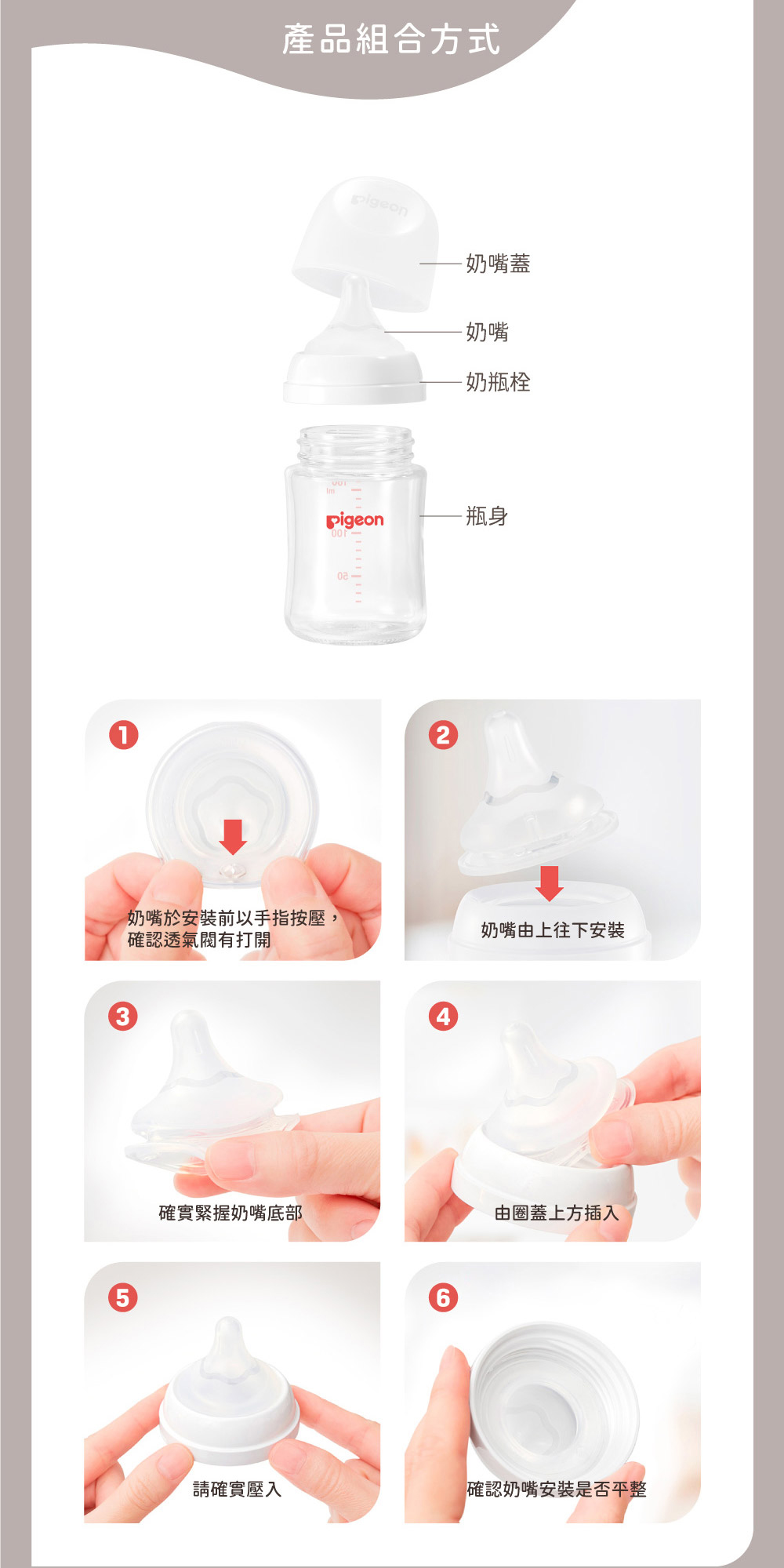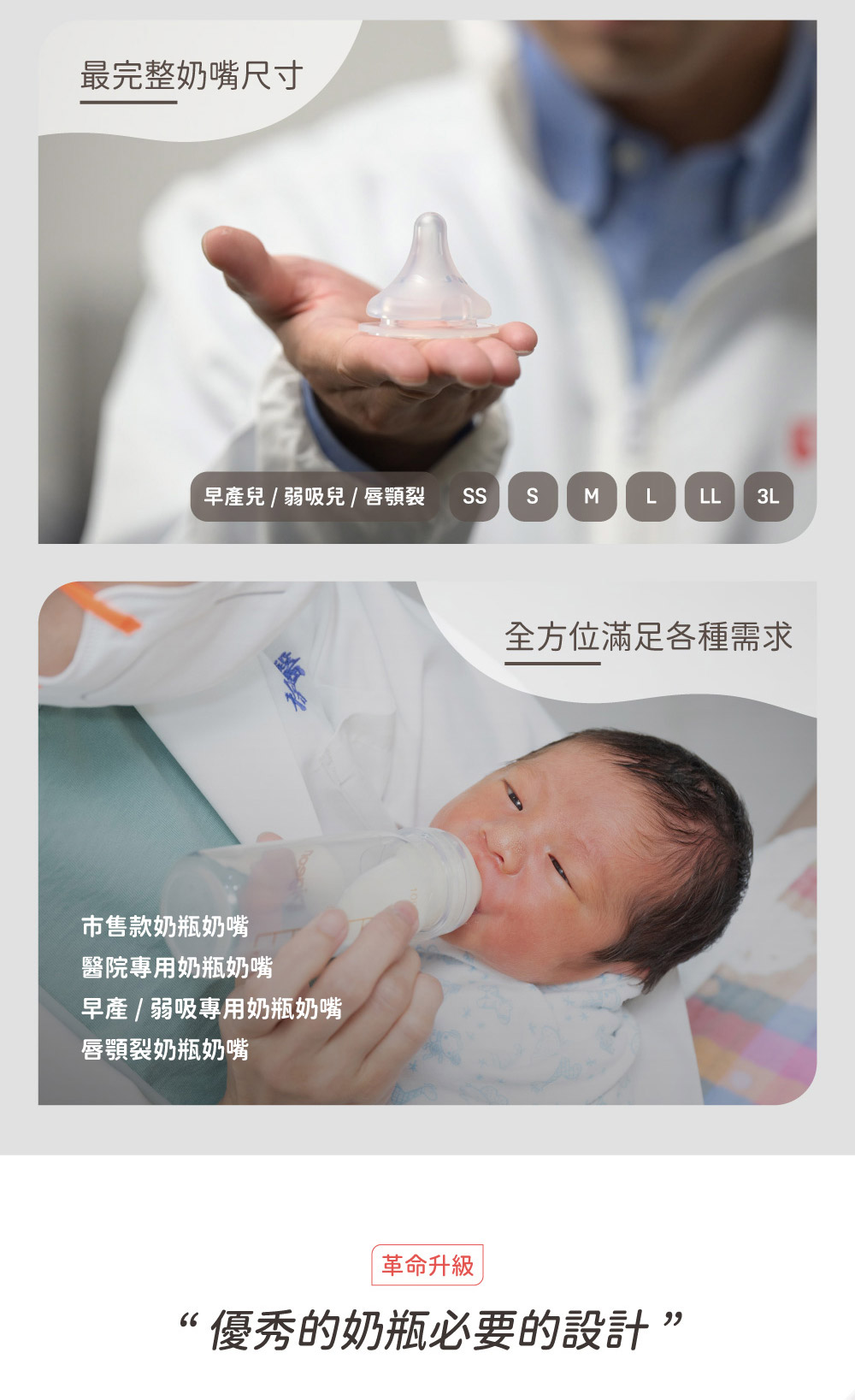 3.量身打造六種尺寸奶嘴:針對不同成長階段,我們量身打造了不同孔徑形狀、大小、軟硬度及吸附線尺寸的六款奶嘴,貼近寶寶個別的需要。