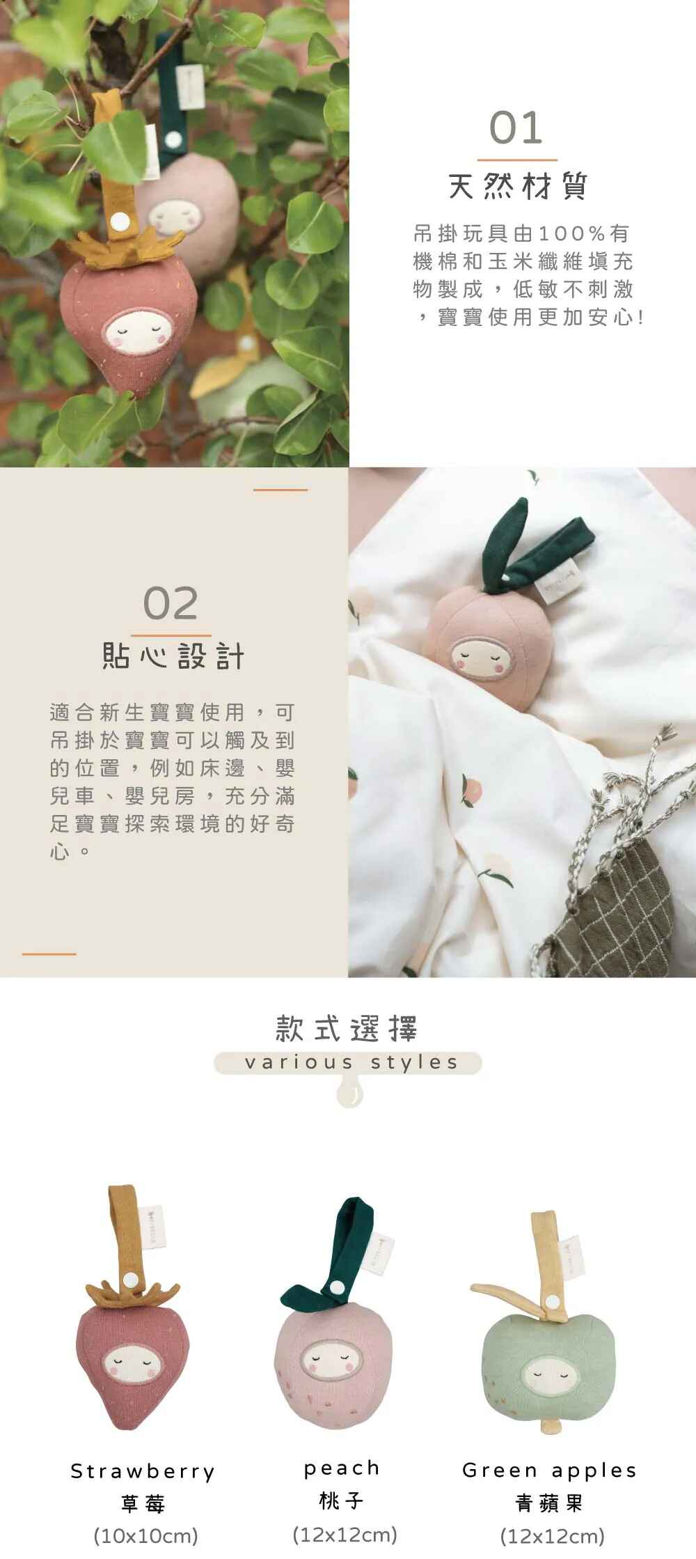 水果系列: 100%有機棉 / 填充物:100%玉米纖維