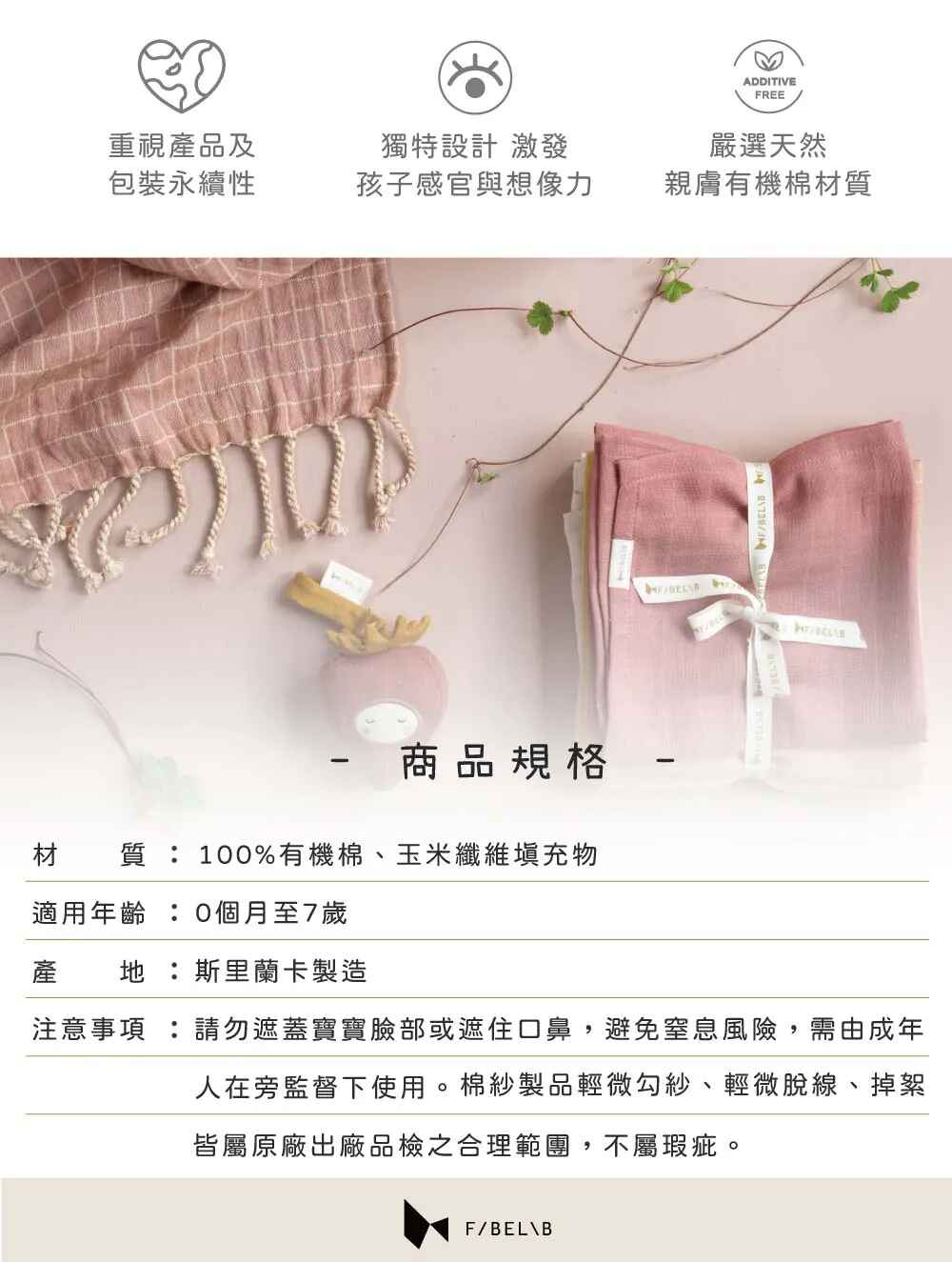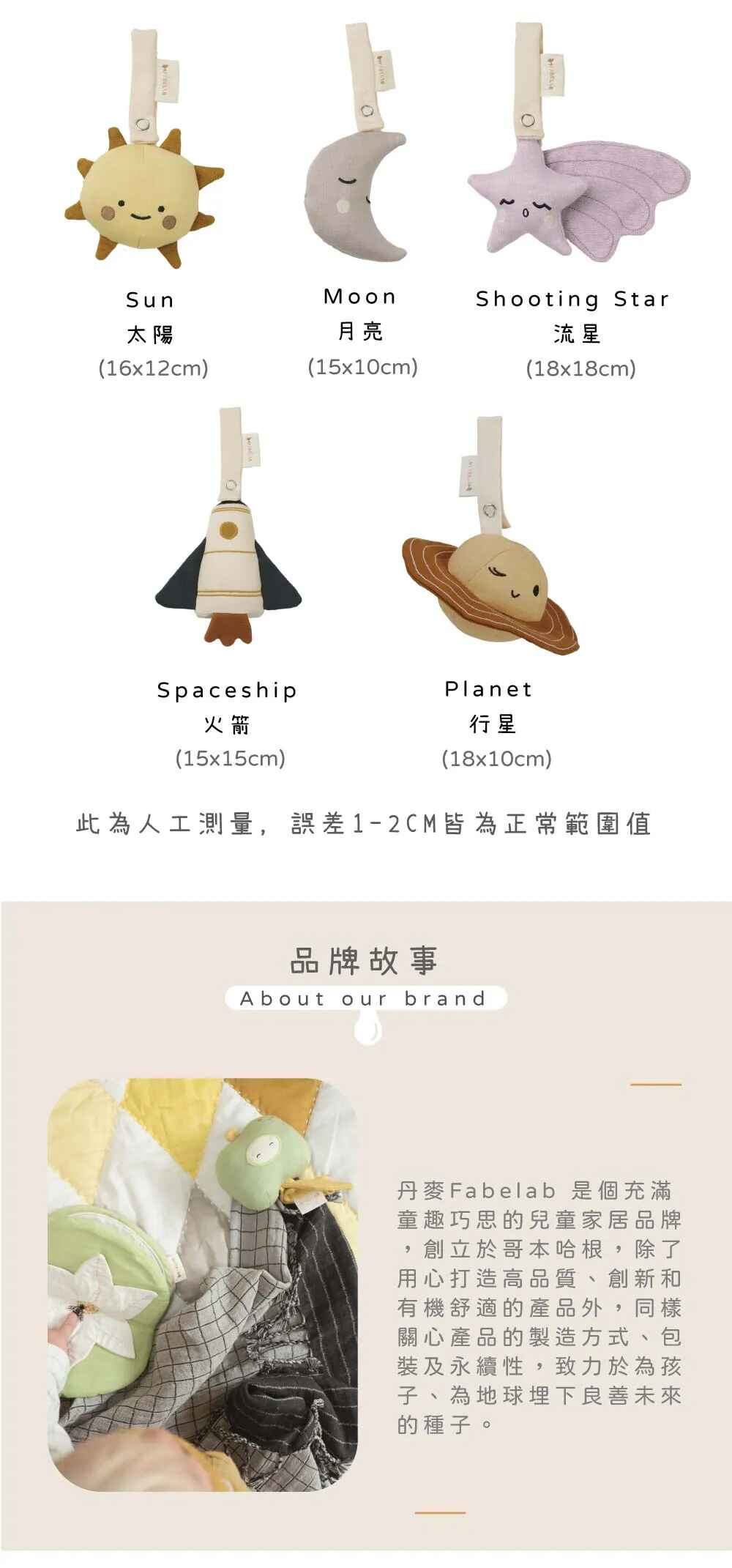星球系列: 100%有機棉 / 填充物:70%玉米纖維&30%聚酯纖維
