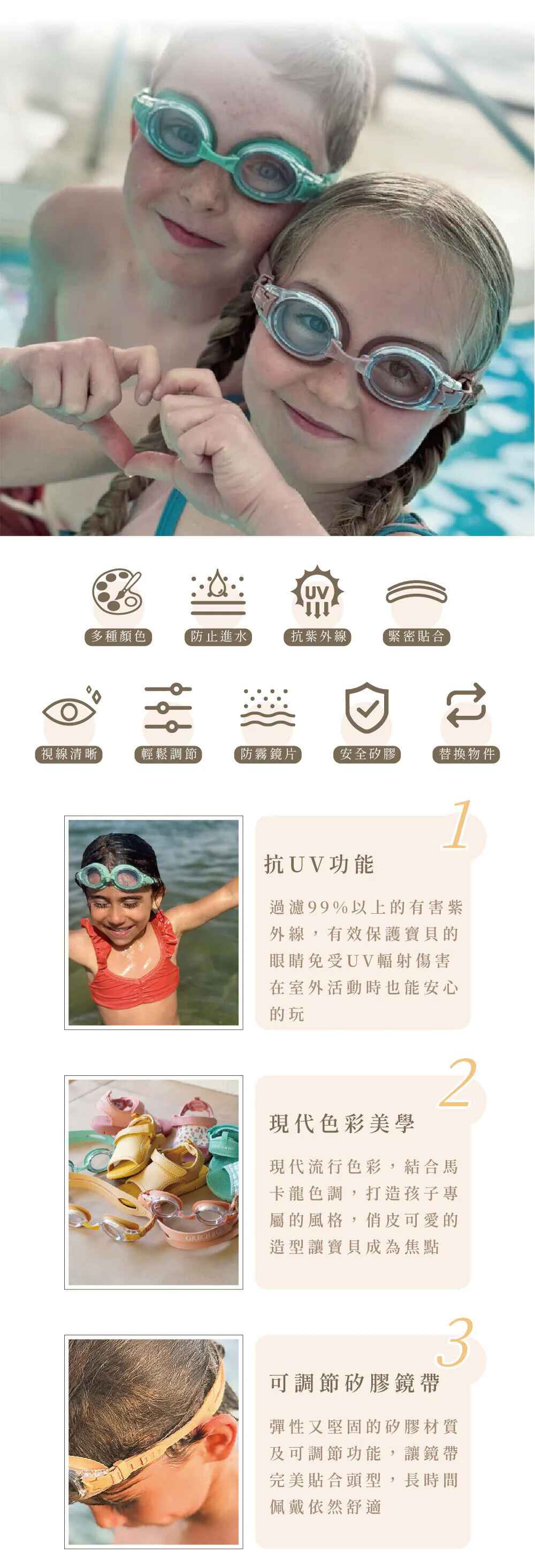 材質:鏡框/PC ; 鼻樑/PU ; 帶/矽膠 ; 鏡片/PC 塑膠