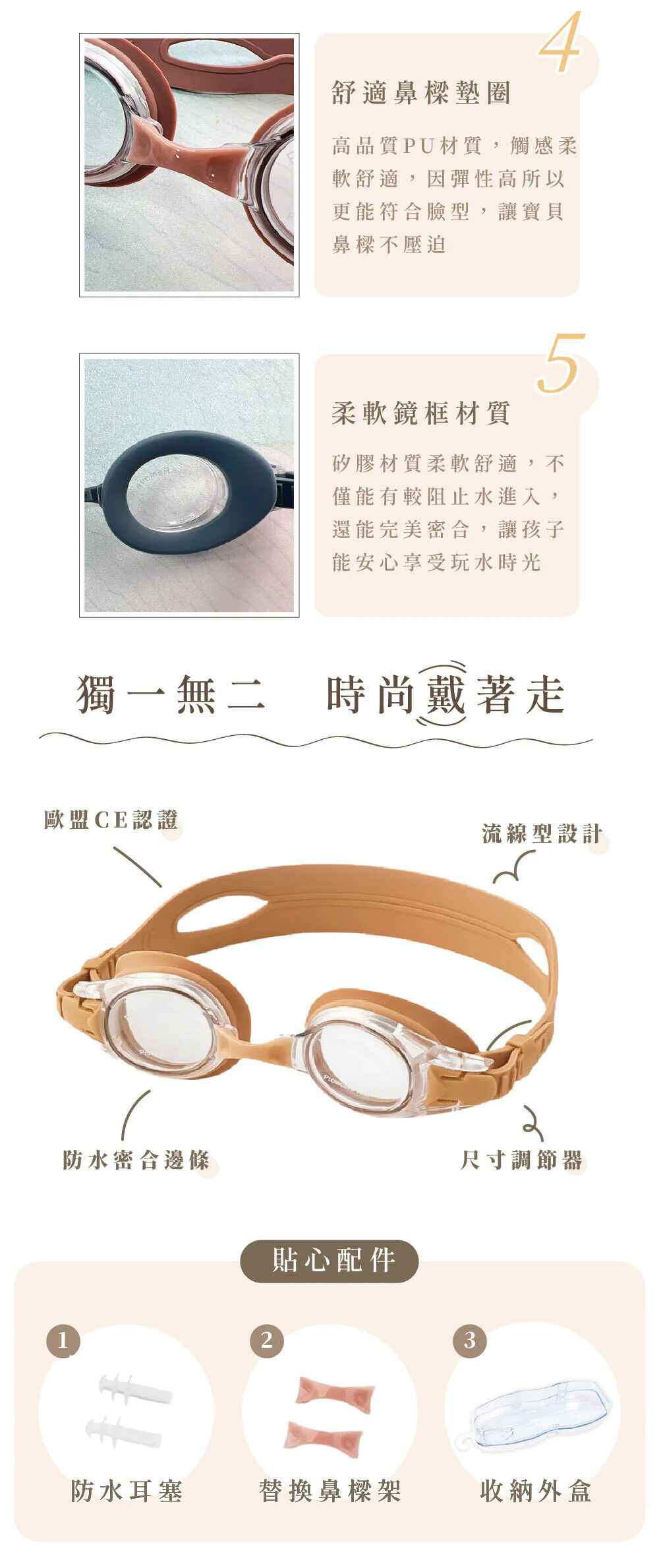 內容物:泳鏡 x1 ; 耳塞 x1對 ; 鼻樑替換件 x2